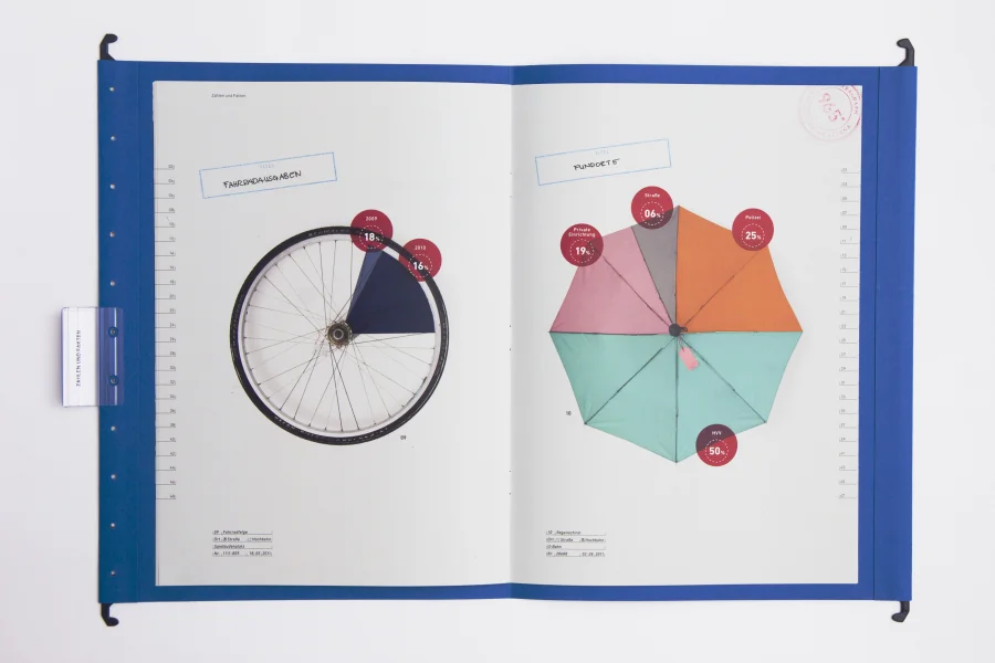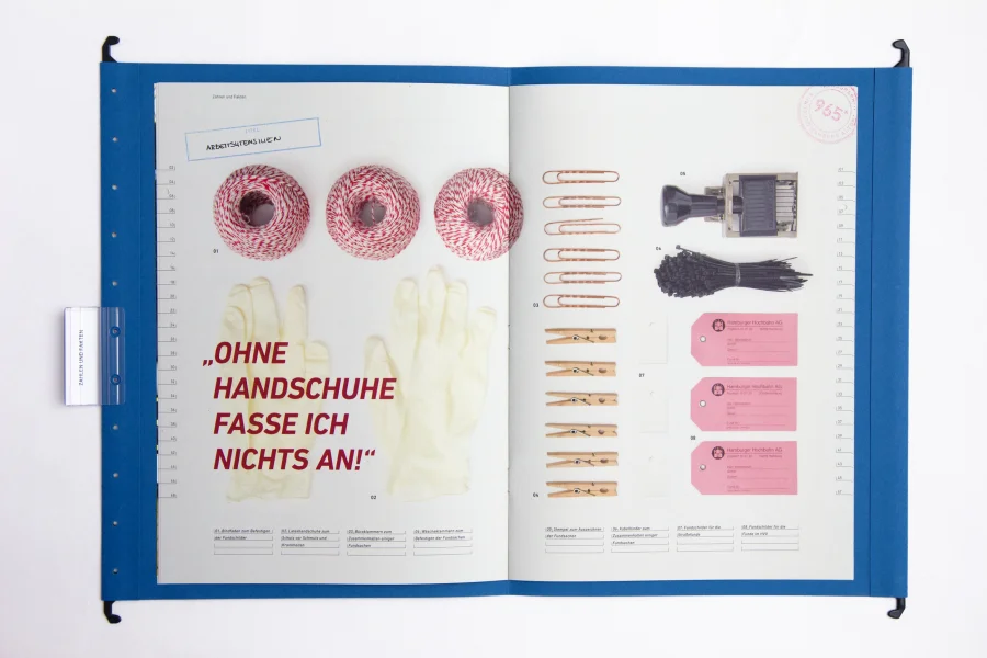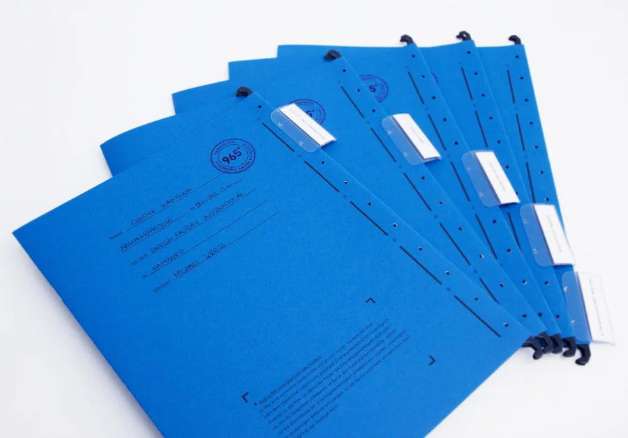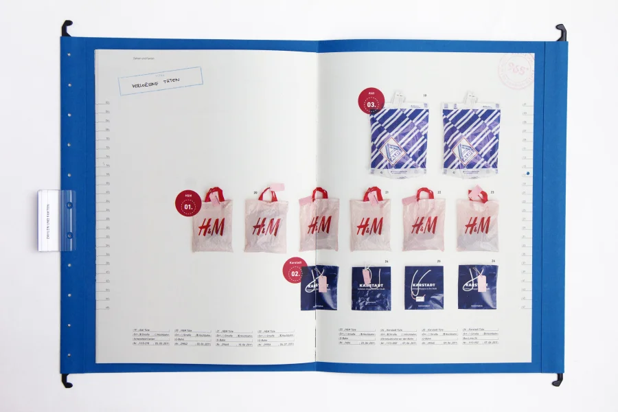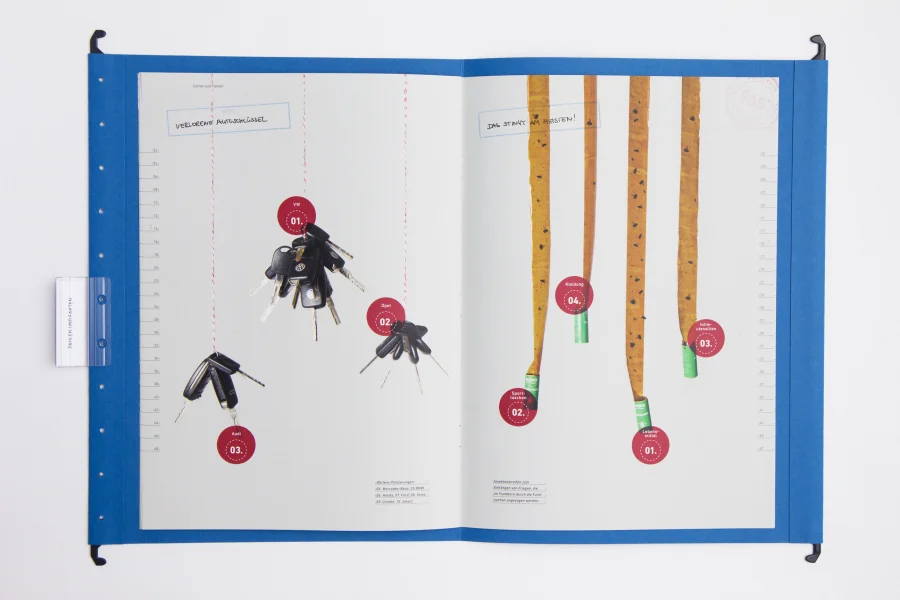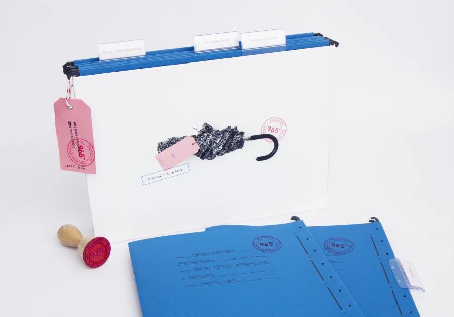Daraus entstanden sind eine Plakatkampagne und das Buchprojekt Paragraph 965*. Das Sternchen im Logo verweist auf den § 965 im BGB, welcher besagt, dass ein Fund mit einem Wert von über Zehn Euro anzeigepflichtig ist. Dieser Paragraph ist der Grundstein eines jeden Fundbüros. Inspiriert von der vorherrschenden Bürokratie und den Themen wie Archivierung und Registratur besteht das Buch aus fünf Hängeakten, die von einem Schuber gehalten werden. Diese wurden selbst angefertigt, im Siebdruckverfahren bedruckt, mit Stempel versehen und mit der eigenen Handschrift beschriftet. Unterteilt sind die Akten in folgende Themen: Verlust- und Fundanzeigen, Einzelfunde, Zahlen und Fakten, Interne Geschichten sowie Taschen- und Kofferinhalte.