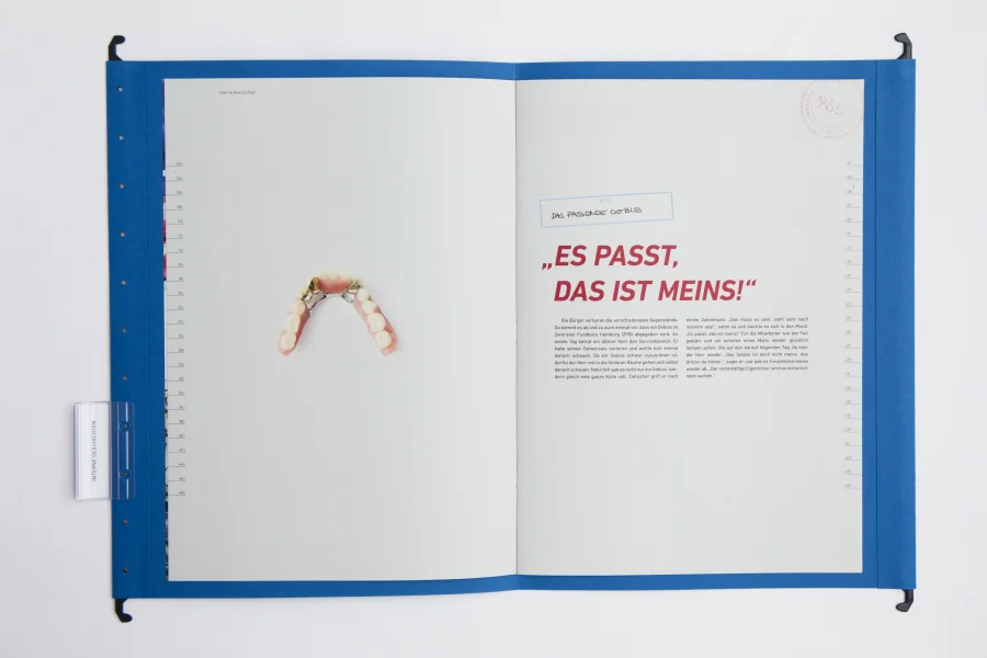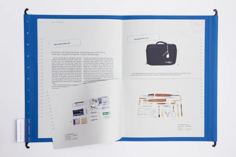In Hamburg gibt es einen ganz bestimmten Ort, an dem viele dieser verlorenen Gegenstände gesammelt und verwahrt werden: Das Zentrale Fundbüro Hamburg in Altona. Für mein Abschlussprojekt habe ich genau diesen Ort aufgesucht. Ich führte Interviews mit Mitarbeitern und Kunden, durfte den Alltag miterleben und ließ mich von den dort vorgefundenen Dingen inspirieren. Ich bekam ein eigenes Büro zugeteilt, baute hinter den Kulissen ein Fotostudio auf und lichtete Mitarbeiter als Modelle vor der Kamera ab.