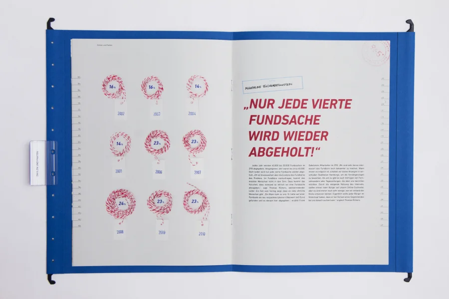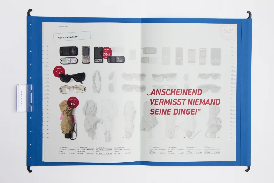 Die Tatsache, dass jedes Jahr 40.000 bis 50.000 Fundsachen im Fundbüro angenommen werden, jedoch nur jede vierte von ihrem Besitzer wieder abgeholt wird, war der Ausgangspunkt für die entwickelte Plakatkampagne. Idee war es auf die Existenz des Fundbüros aufmerksam zu machen und aufzuzeigen welche unterschiedlichsten Fundstücke dort auf ihre Eigentümer warten.