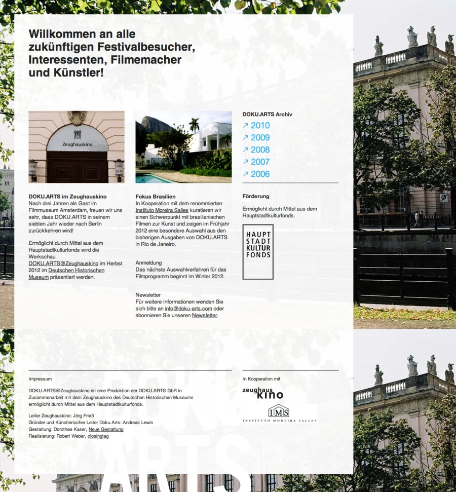 Ermöglicht durch Mittel aus dem Hauptstadtkulturfonds wird die Werkschau DOKU.ARTS@Zeughauskino im Herbst 2012 im Deutschen Historischen Museum präsentiert.
