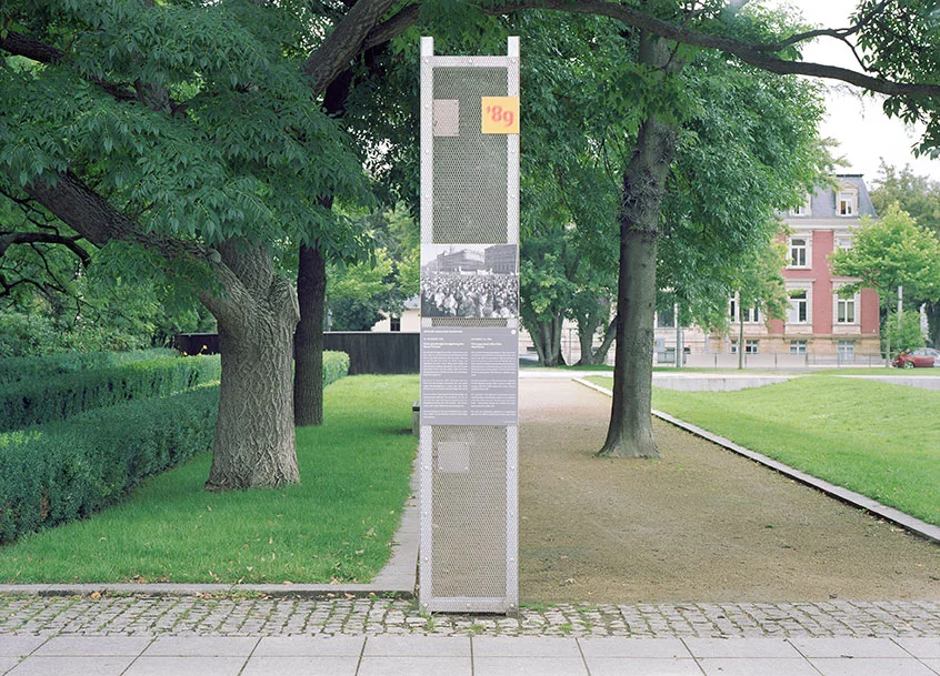 Die Besonderheit, Vielschichtigkeit und Einmaligkeit des Gesamtereignisses Friedliche Revolution in Leipzig wird anhand von Fotos sowie deutschen und englischen Texten vermittelt. Auf den Stelen aus Streckmetall, das in der DDR für Grenzsicherungsanlagen eingesetzt wurde, informieren Tafeln über bedeutende Aktionen des politischen Widerstandes in Leipzig. Die Idee der Informationstafeln ist angelehnt an Formen der Erinnerungskultur, wie man sie nach einschneidenden Erlebnissen an vielen Orten des Geschehens findet: Menschen hängen Zettel, Schildchen, Blumen, Kerzen oder anderes an Zäune, um ihren Gefühlen Ausdruck zu verleihen. So etwa auch im Herbst 1989, als Leipziger Bürger auf diese Art und Weise an der Nikolaikirche die Freilassung von politischen Gefangenen forderten. Durch die Stelen wird die zeitliche und räumliche Entwicklung der Friedlichen Revolution erlebbar. Zudem wird der Stadtwandel seit 1989 durch die historischen Fotografien nachvollziehbar.