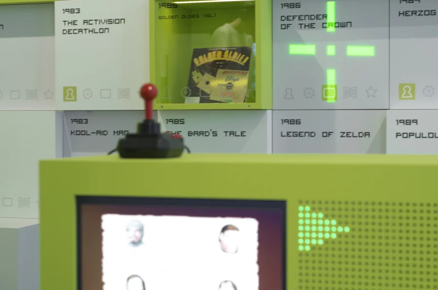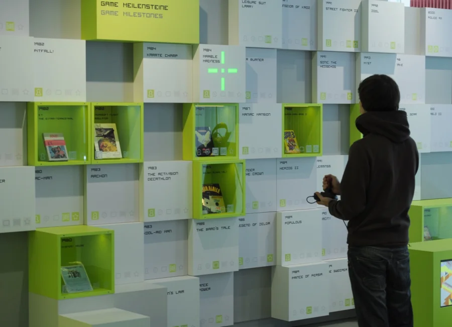 Die interaktive Installation „Game Milestones“ in der Dauerausstellung des Computerspielemuseums Berlin. Eine Wand aus Kuben („Pixel“) repäsentiert die innovativsten und einflussreichsten Computerspiele, die Meilensteine, in chronologischer Reihenfolge.