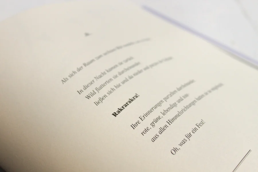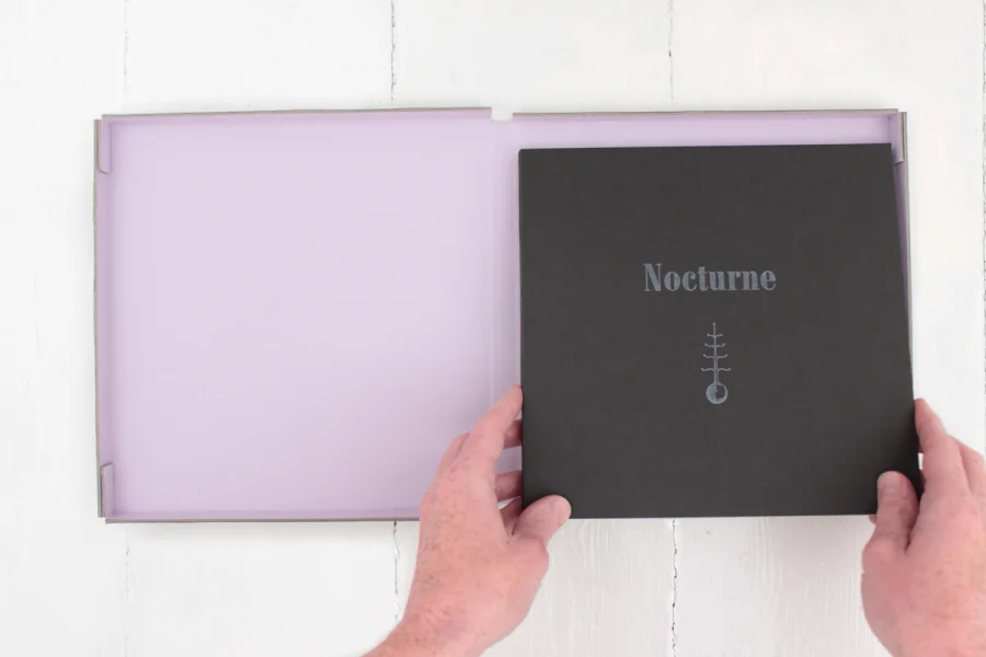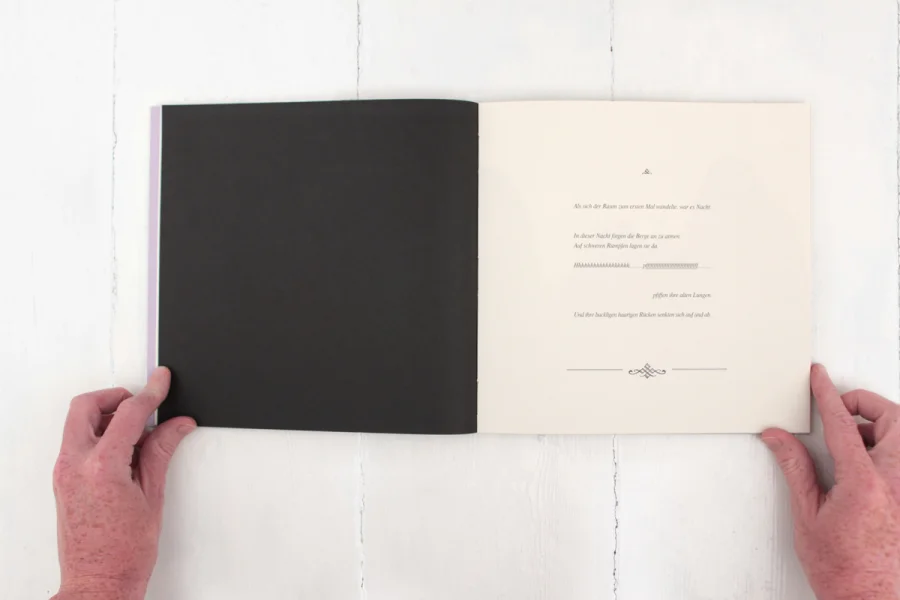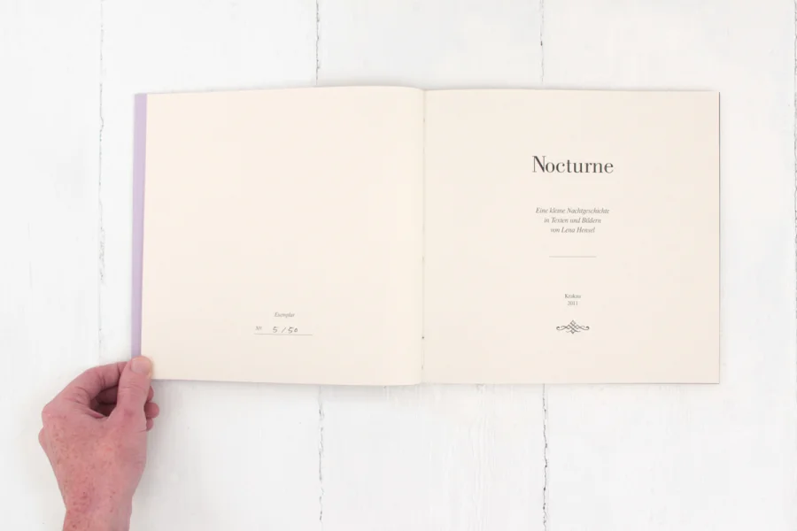 Als sich der Raum zum ersten Mal wandelte, war es Nacht. In dieser Nacht fingen die Berge an, zu atmen. (…) So beginnt Nocturne – eine kleine Nachtgeschichte in Texten und Bildern von Lena Hensel. Das Czarodziejska Projekt, ein deutsch-polnisches Design & Kunst Studio mit Sitz in Berlin, hat dieses in limitierter Auflage erschienene Künstlerbuch gestaltet. Das Buch liegt in seinem Karton und ‘schläft’, jeder Käufer erweckt sein Buch selbst. Bei der Gestaltung des Kartons haben wir die gleichen Materialien und Farben wie bei der Gestaltung des Buchinneren benutzt.