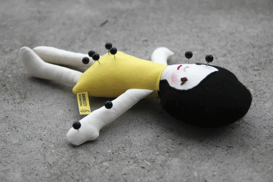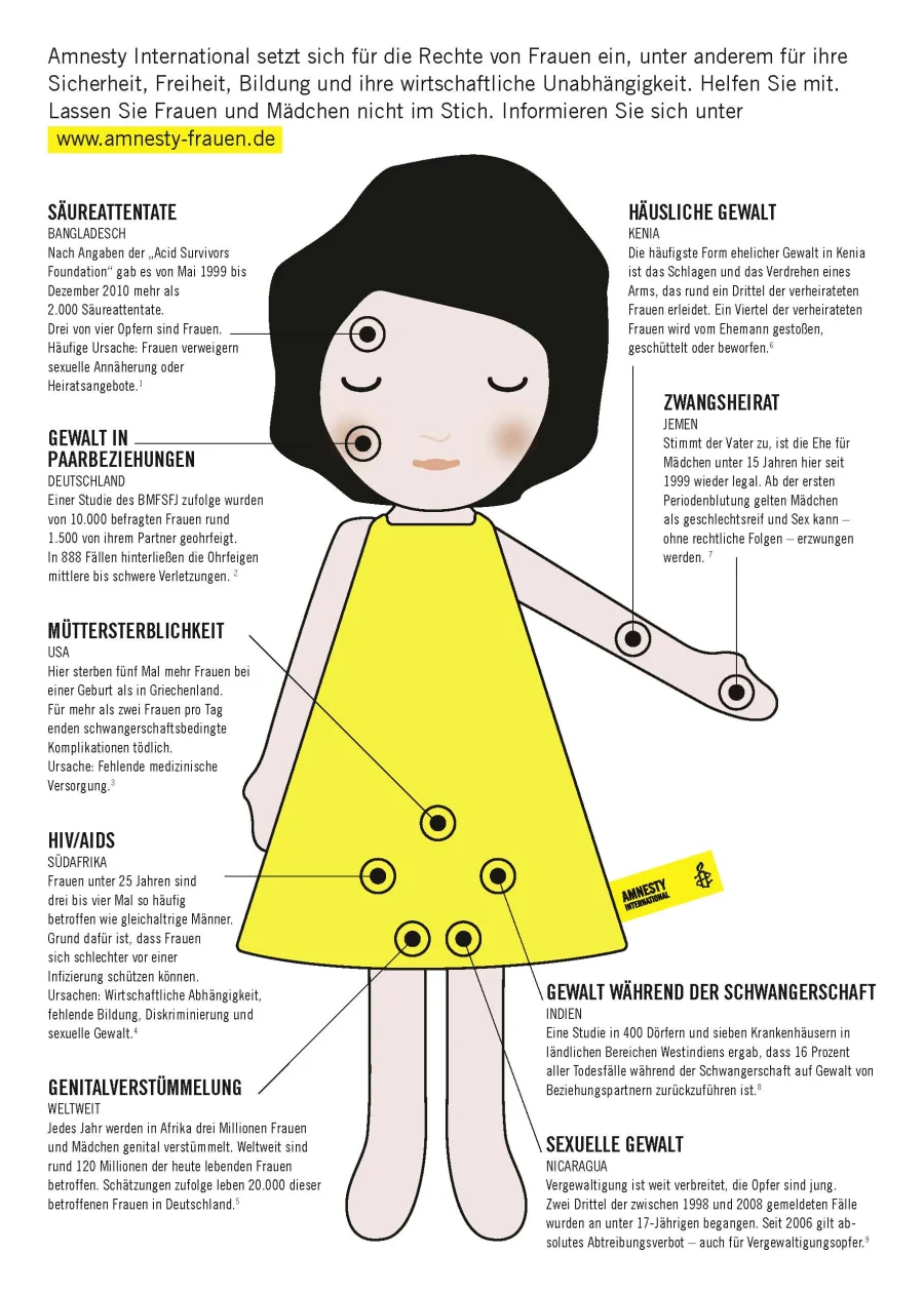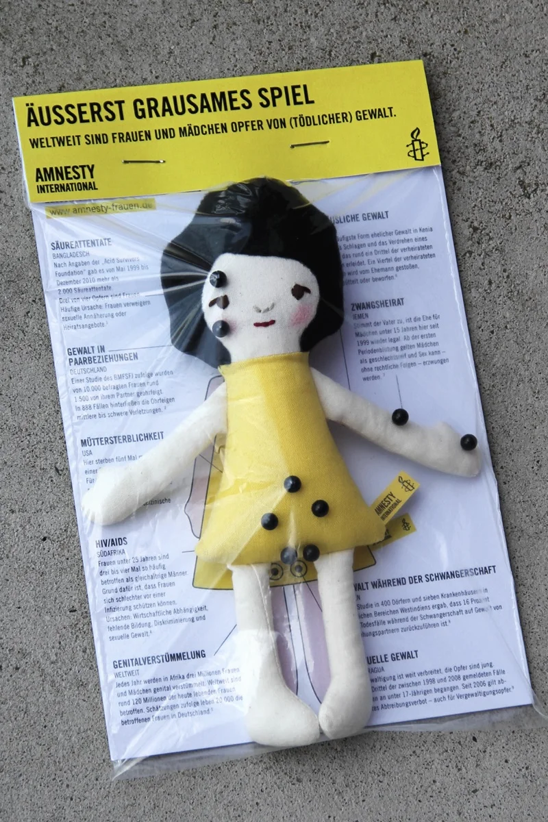 Ein Päckchen mit einer „niedlichen“ Stoffpuppe lädt ein zum Hingucken und Zugreifen. Doch in der Puppe stecken Nadeln – als Symbol für Verletzungen, die Frauen weltweit durch Gewalttaten zugefügt werden. Auf einer Legende in der Verpackung sind erschreckende Ergebnisse von Studien zu Gewalt gegen Frauen prägnant zusammengefasst, von Zwangsheirat über häusliche Gewalt bis hin zu Genitalverstümmelung.