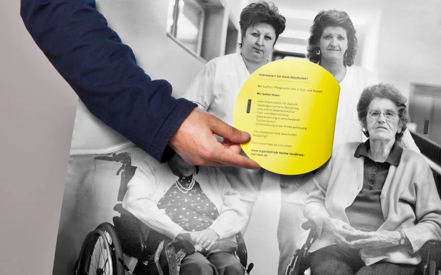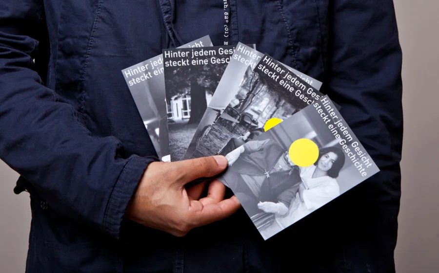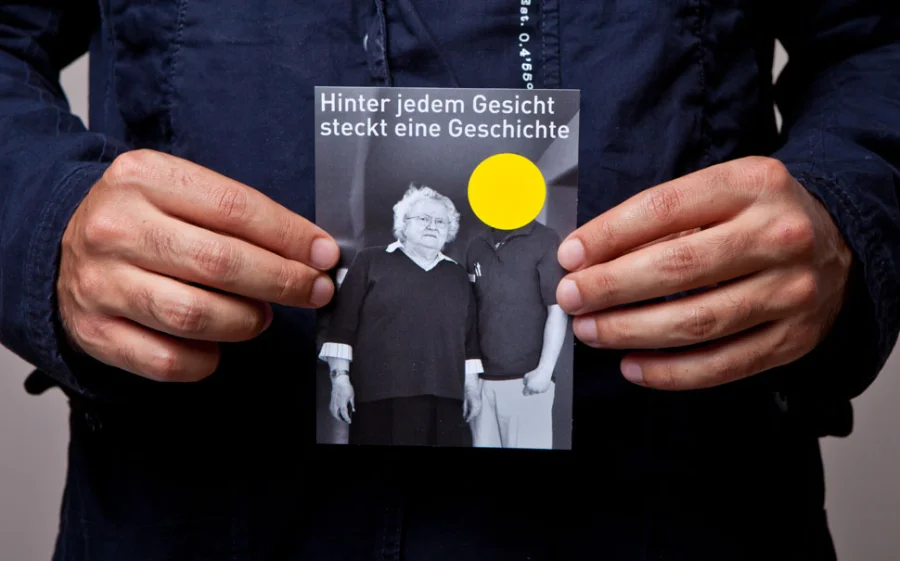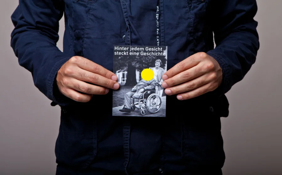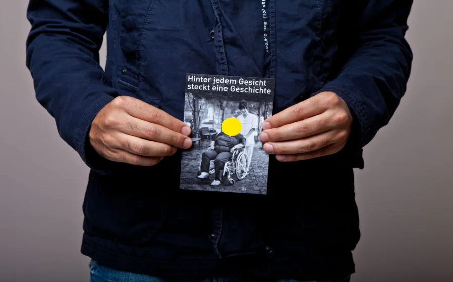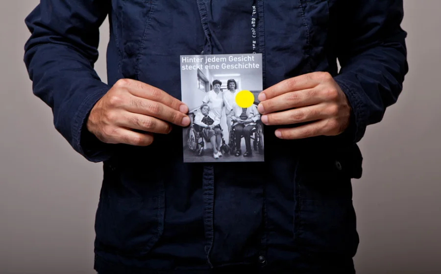 Die Plakate „Hinter jedem Gesicht steckt eine Geschichte“ haben zwei Ebenen, die Gesichter und Geschichten zeigen. Mit gelben Punkten sind abwechselnd die Gesichter der Bewohner und der Pflegenden verdeckt. Diese Punkte sind aufklappbar und stellen die Frage „Interessiert Sie diese Geschichte?“. Die Fragen und Interaktionen des Plakates unterstreichen unseren Anspruch an Zwischenmenschlichkeit und sollen zum Nachdenken anregen.