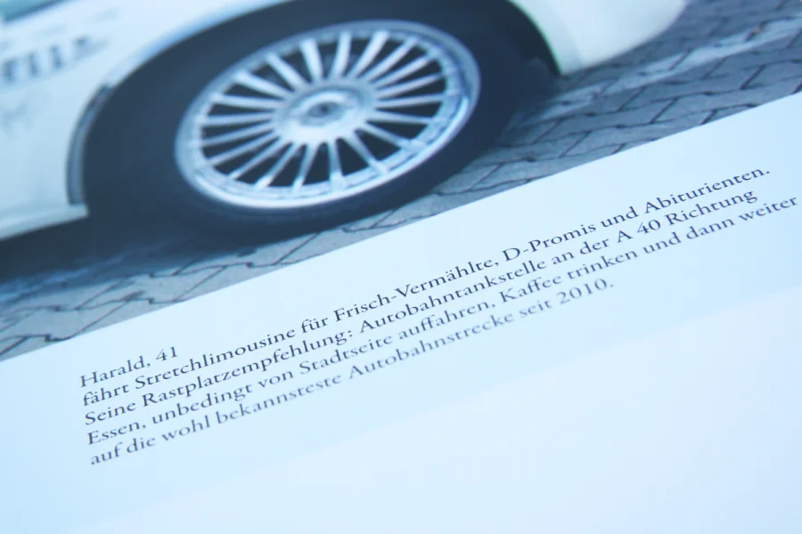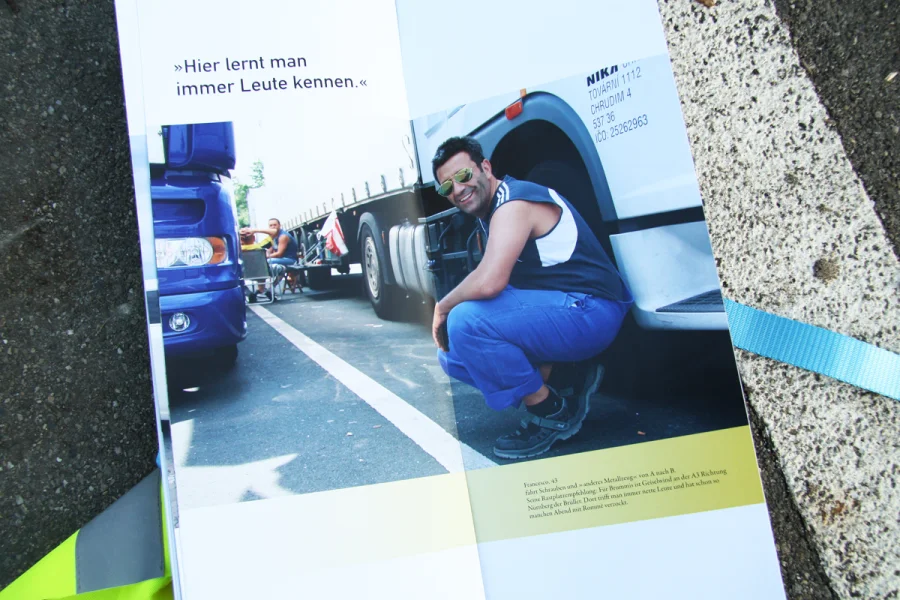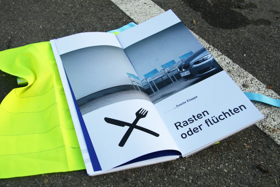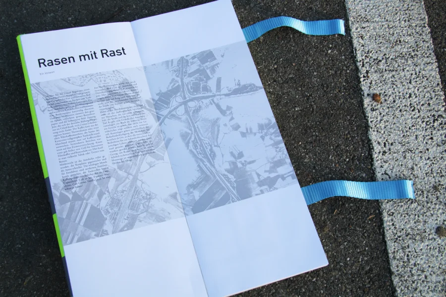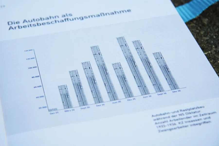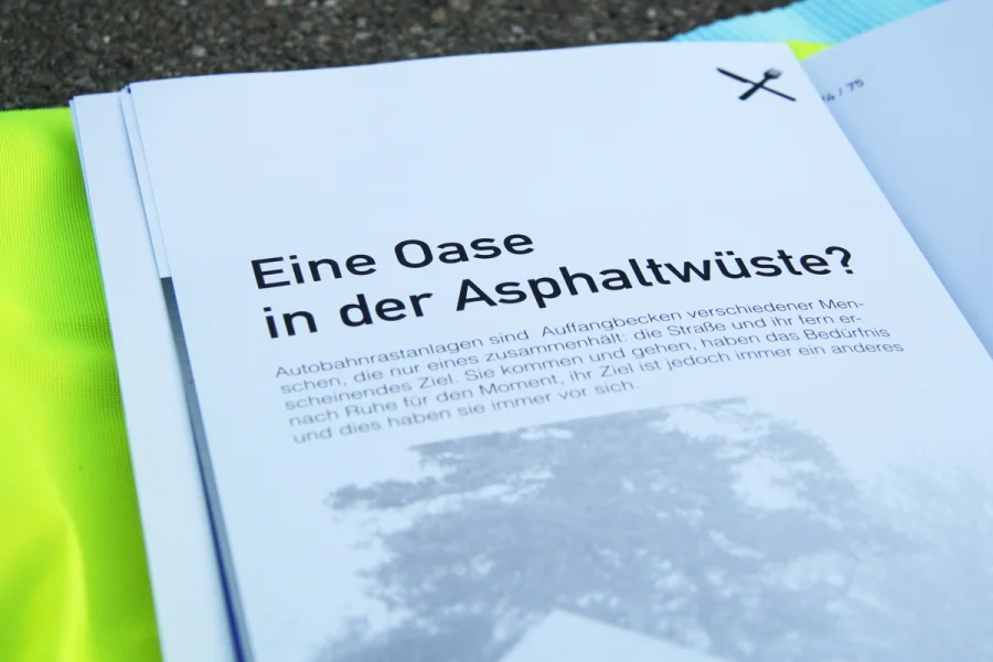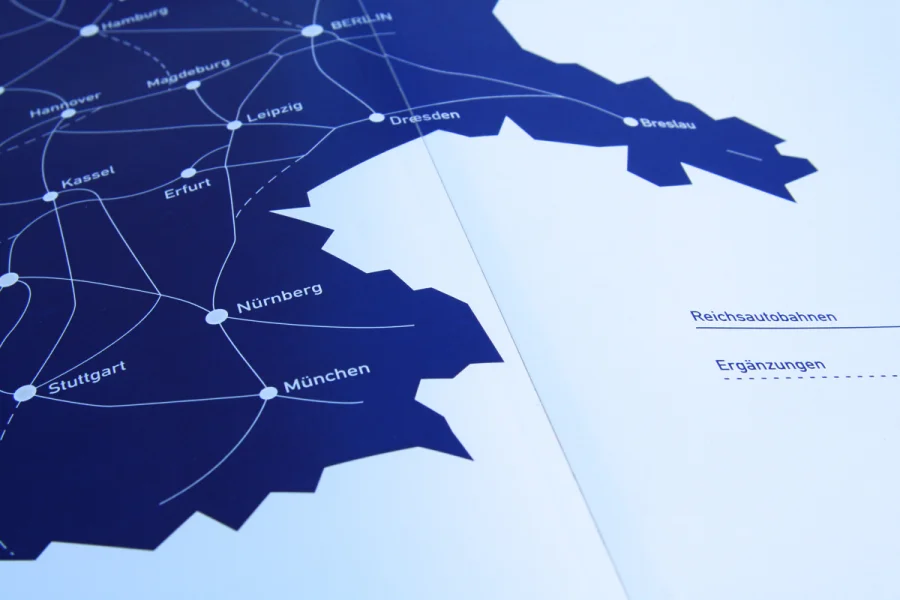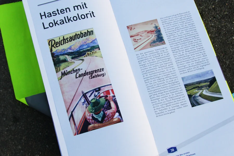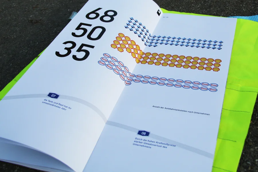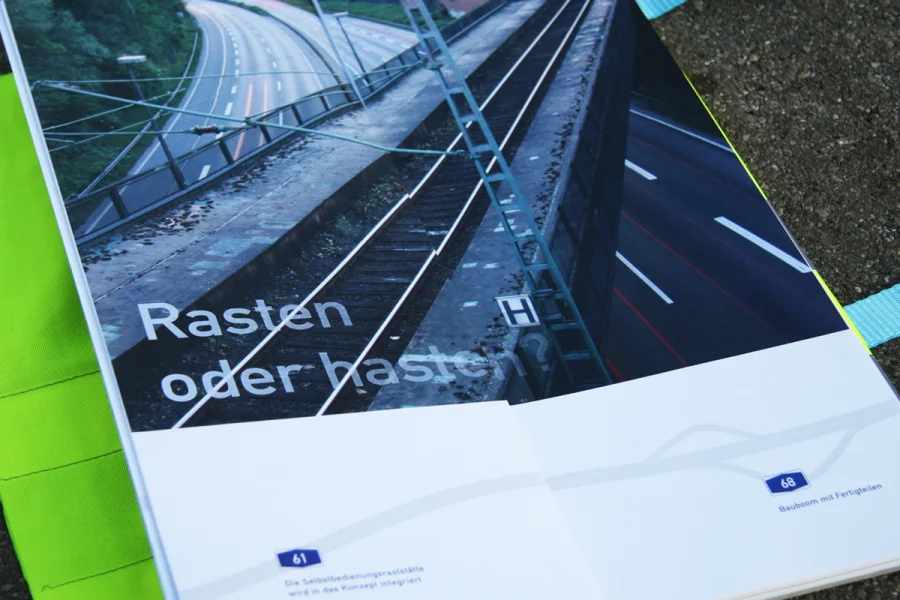 In der ersten Etappe des 150-seitigen Buches geht es um die Geschichte der Rastplätze. Hier wurde auf zwei Ebenen gearbeitet. Während im oberen Bereich die Geschichte auf journalistischer und dokumentarischer Ebene aufgearbeitet worden ist, befinden sich im unteren Bereich der Seiten chronologisch die wichtigsten Eckpunkte. Grafiken, Karten und besondere Informationen sind in Blau und Grau gehalten worden, ferner wurde mit der DIN als Headlineschrift und der Times als Leseschrift gearbeitet. Weißraum, Blocksatz und Format (A3 Hochformat) dienen gleichfalls als Anmutungen, die wir auf der Autobahn und ihrer Umgebung wieder finden.
