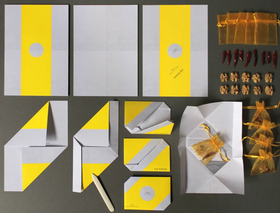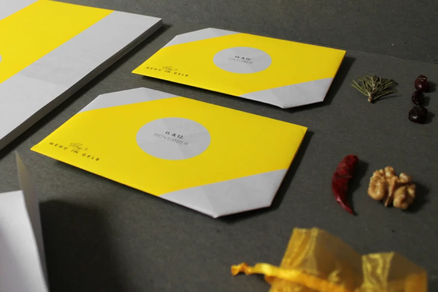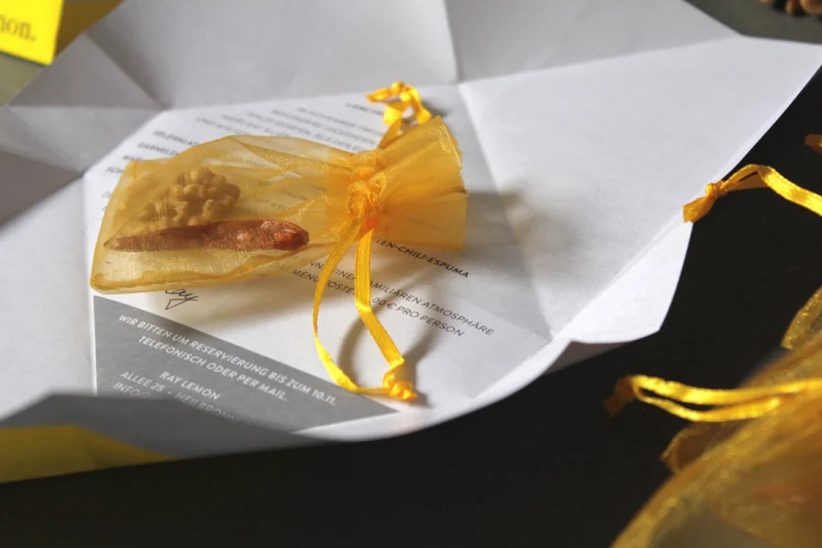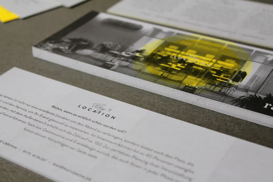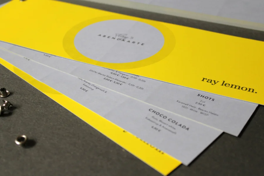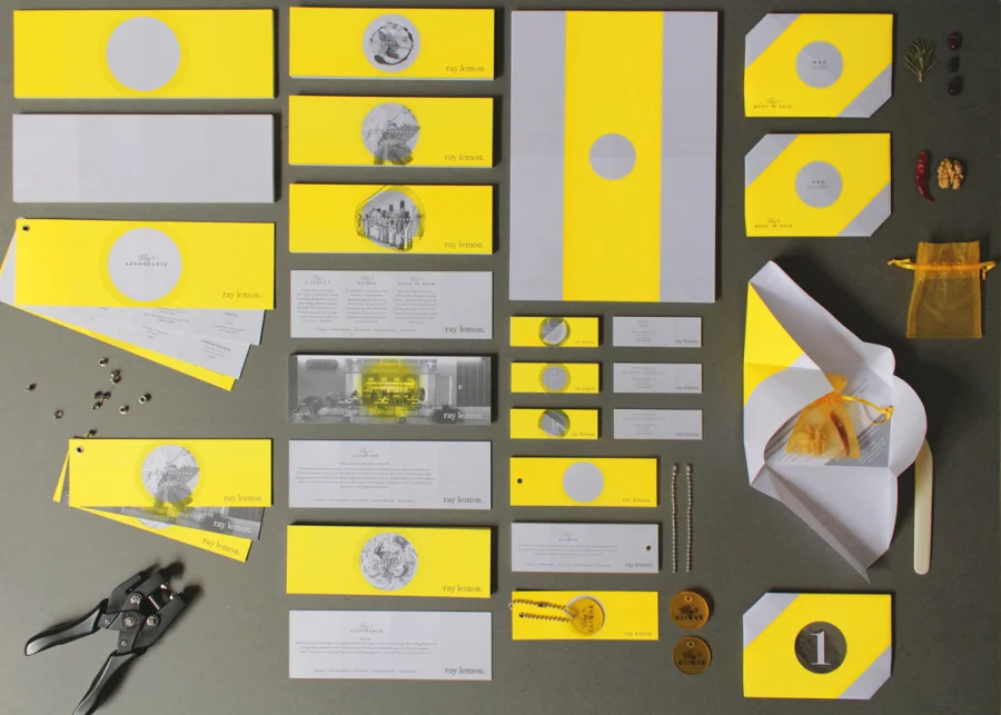 Für das „Ray Lemon“, Restaurant und Bar, erstellen wir ein Kommunikations- und Designkonzept mit zwei Konstanten: Der Hausfarbe Gelb im Zusammenspiel mit dem vorhandenen Sichtbeton sowie der fiktiven Person „Ray“. Dieser tritt ab jetzt persönlich in jeglichem Dialog auf und etabliert sogar einen eigenen Freundeskreis, die Clique, leicht zu erkennen an den geprägten Marken. Die Einladungen zum Event „Menu in Gelb“ versehen wir jeweils mit den verwendeten Gewürzen und erzeugen durch die Origami-Faltung einen hochwertigen und individuellen Charakter.