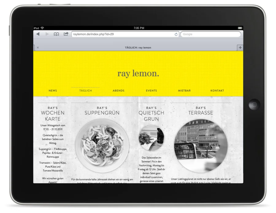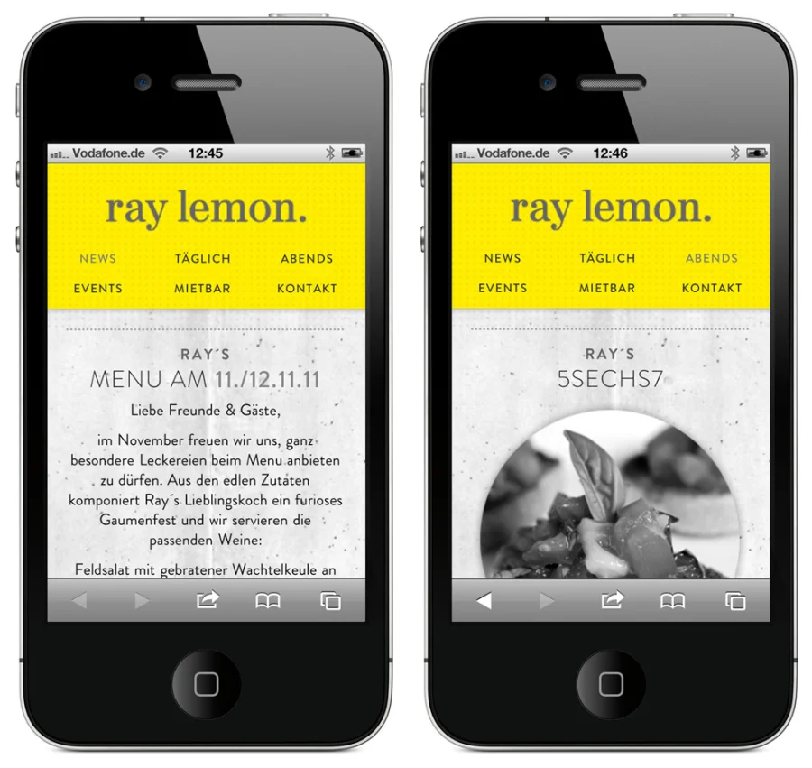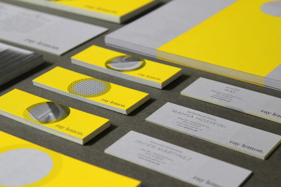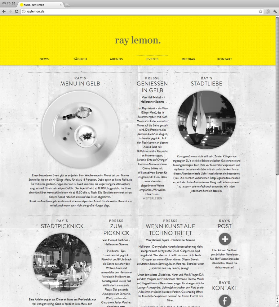 Für das „Ray Lemon“, Restaurant und Bar, erstellen wir ein Kommunikations- und Designkonzept mit zwei Konstanten: Der Hausfarbe Gelb im Zusammenspiel mit dem vorhandenen Sichtbeton sowie der fiktiven Person „Ray“. Dieser tritt ab jetzt persönlich in jeglichem Dialog auf und etabliert sogar einen eigenen Freundeskreis, die Clique, leicht zu erkennen an den geprägten Marken. Die Einladungen zum Event „Menu in Gelb“ versehen wir jeweils mit den verwendeten Gewürzen und erzeugen durch die Origami-Faltung einen hochwertigen und individuellen Charakter.