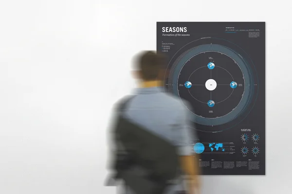 Das Plakat zeigt eine Informationsgrafik über die Entstehung der Jahreszeiten und Klimazonen.