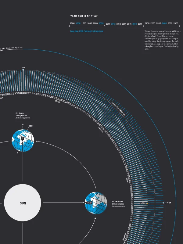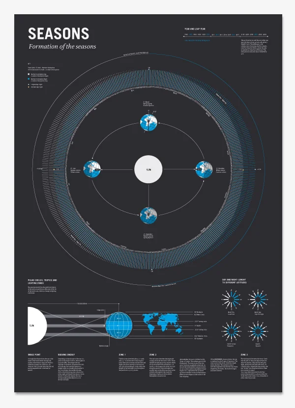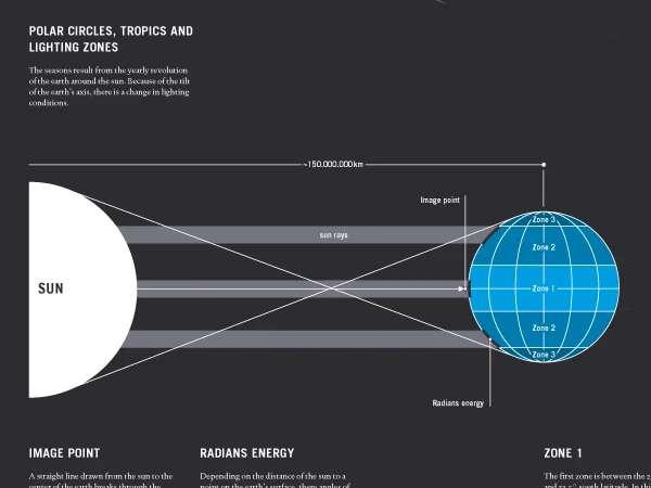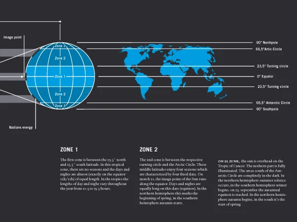 Die Hauptgrafik stellt die jeweilige Dauer von Tag und Nacht auf der Nord- und der Südhalbkugel, welche durch die schräg stehende Erdachse entstehen, dar. Weitere Grafiken erklären die Beleuchtungszonen auf der Erdkugel und die daraus entstehenden Klimazonen.