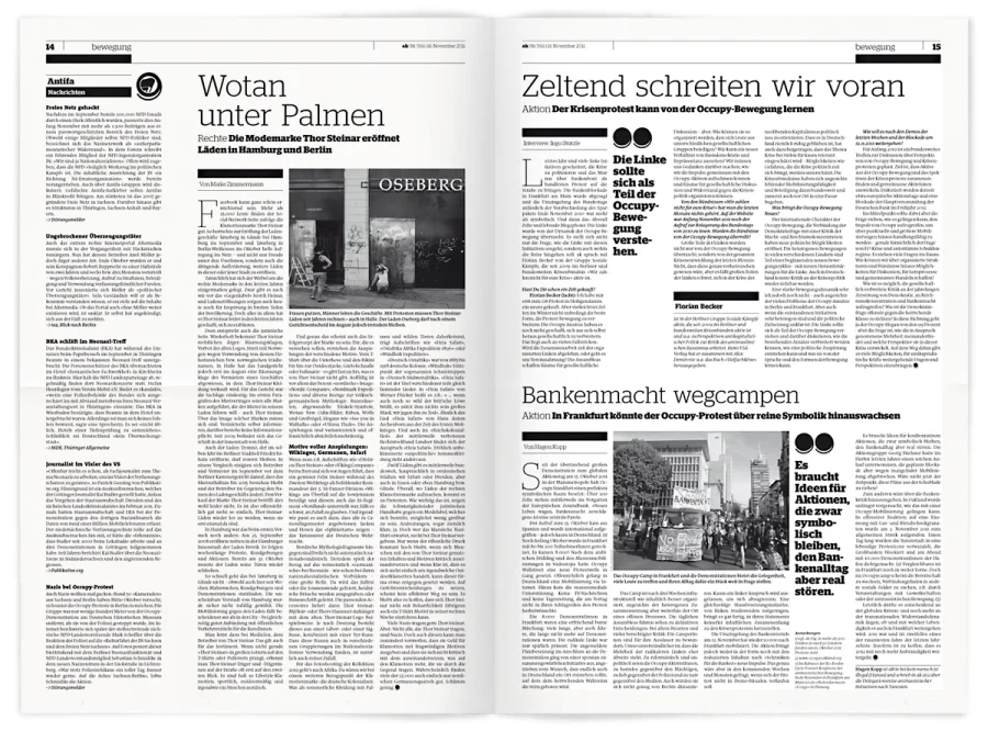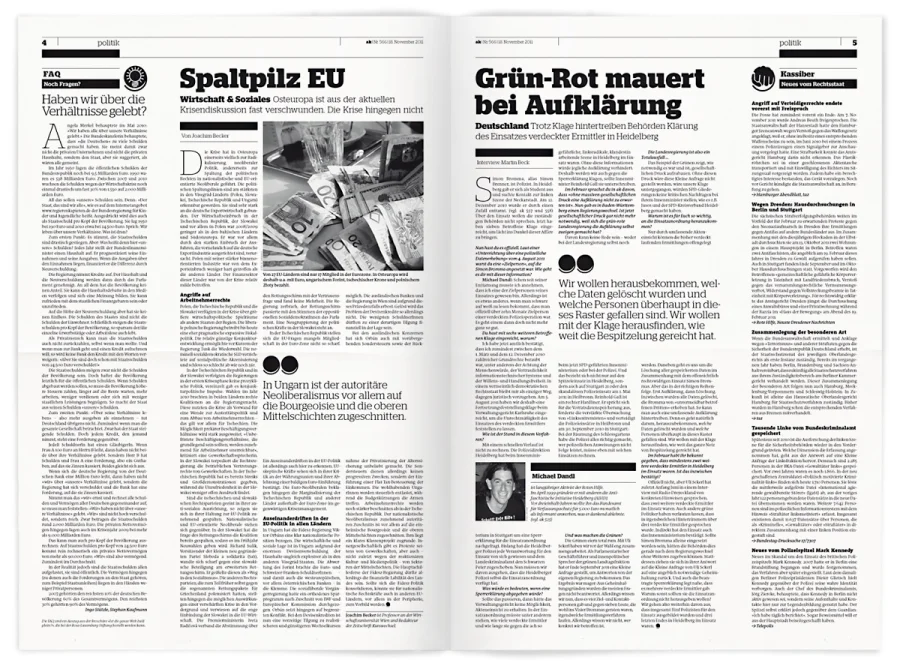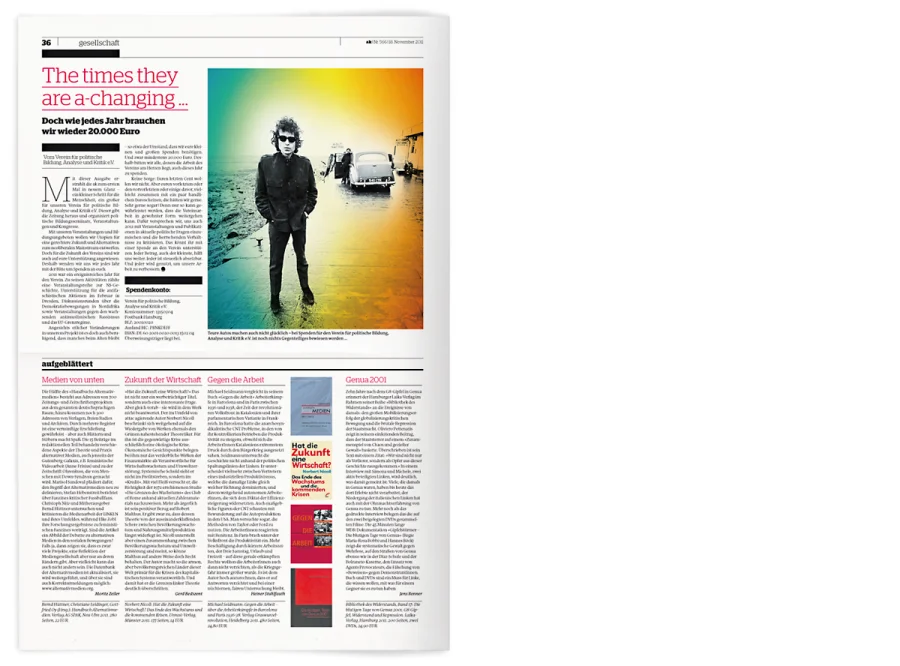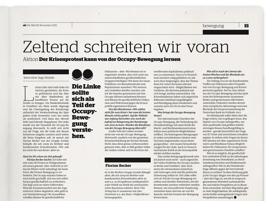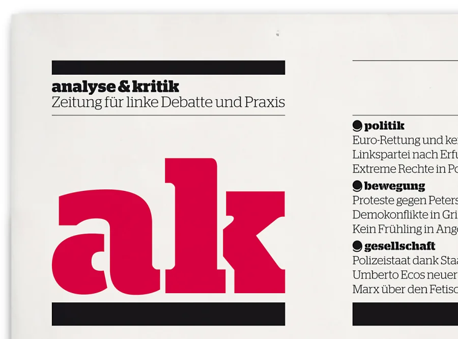 Zu ihrem 40-jährigem Bestehen wurde »ak« nun komplett überarbeitet. Die Redaktion hat sich lange Gedanken über die Zukunft der Zeitung und damit verbunden über die Chance eines Redesigns, gemacht. Dieser Prozess erfolgte unter professioneller Anleitung. Die »ak«-Redaktion beauftragte mich mit recht klaren Vorstellungen wohin sie redaktionell möchte, was die Arbeit sehr erleichtert hat. In der ersten Ausgabe im neuen Design geht es u.a. genau darum: Warum heute eine linke Zeitung machen? Und das auch noch auf Papier… Antworten geben u.a. der Schriftsteller Dietmar Dath, der Soziologe Gottfried Oy sowie der niederländische Medientheoretiker Geert Lovink.