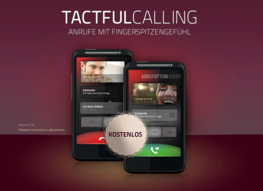 In diese Lücke stößt eine App, die das Design Research Lab der Deutschen Telekom zusammen mit dem EAF und IxDs entwickelt hat. Der Name Tactful Calling zeigt bereits an, worum es geht. Sie ist als Lösung gedacht, auf gerade unpassende Anrufe zu reagieren. Dabei wird dem Anrufer nicht nur gezeigt wer anruft, sondern auch wie dringend sein Anruf ist. Auf der anderen Seite kann der Angerufene signaliseren, warum er gerade nicht abnehmen kann. Die Macher nennen es »Anrufe mit Fingerspitzengefühl«.
