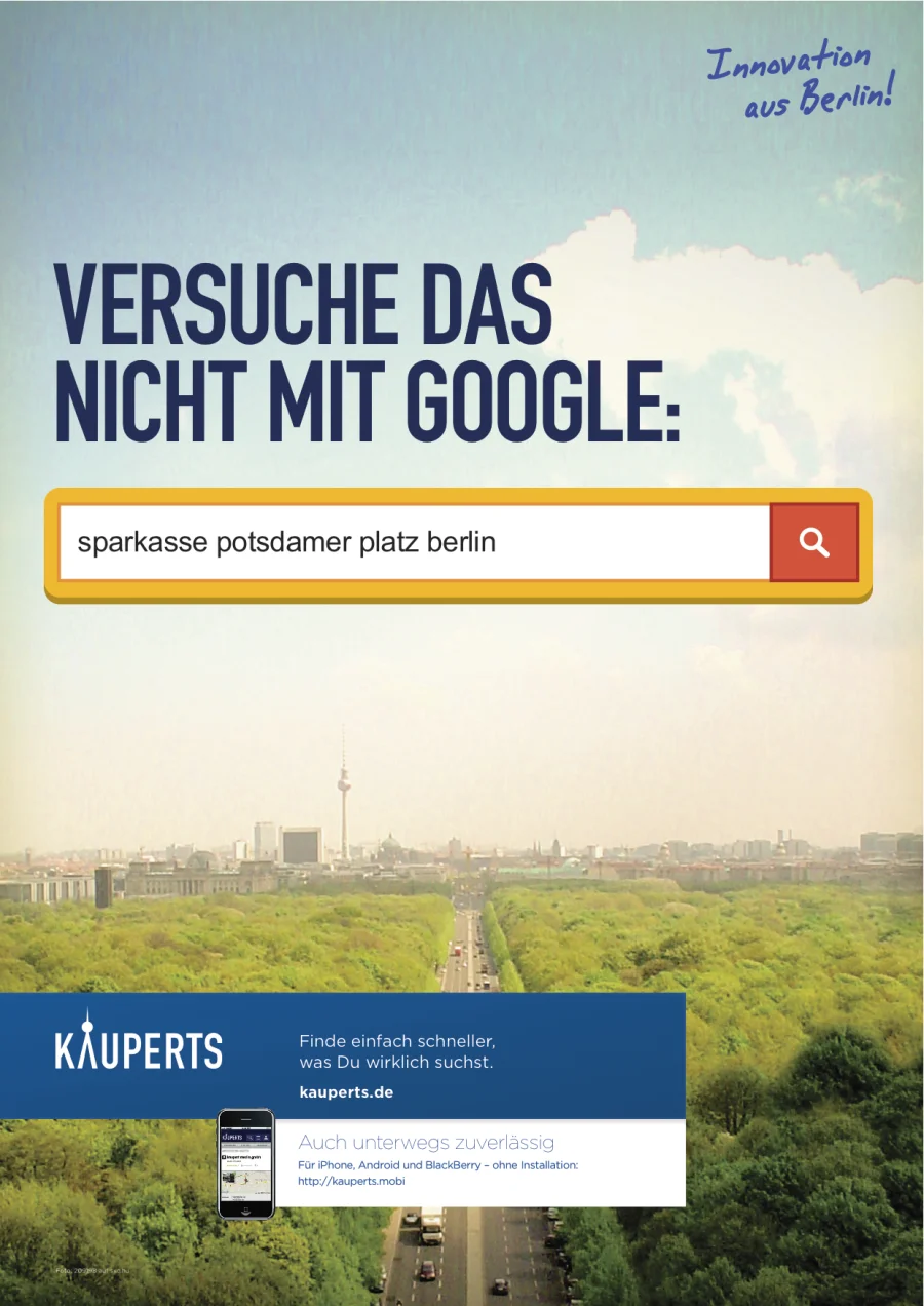 Kauperts hat seit 1946 Erfahrung mit Verzeichnismedien, die für ihre Zuverlässigkeit bekannt sind. Die Anzeige spielt darauf an und zeigt anhand eines praktischen Beispiels, wie unterschiedlich die Qualität der lokalen Suche bei Google und bei Kauperts ist.