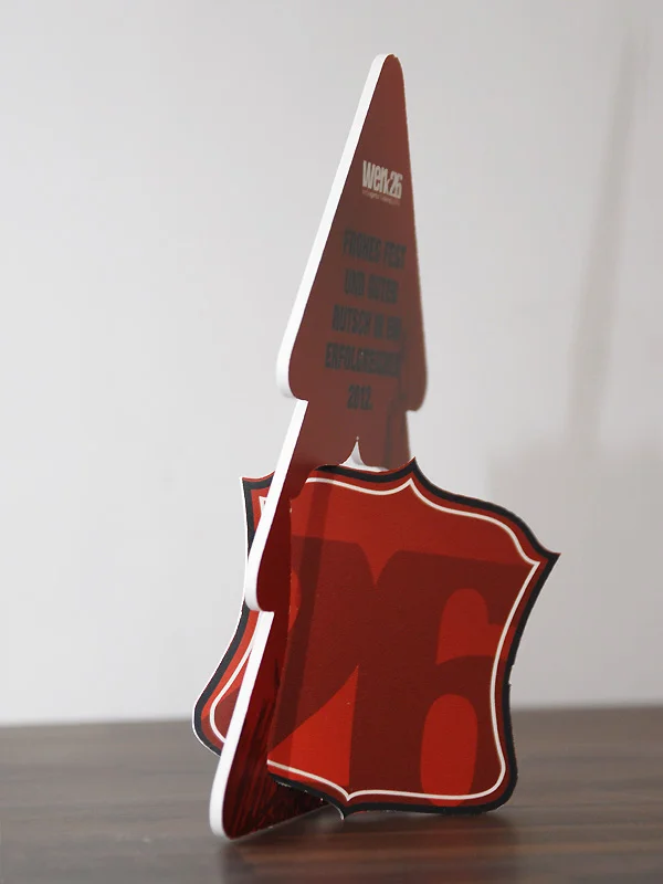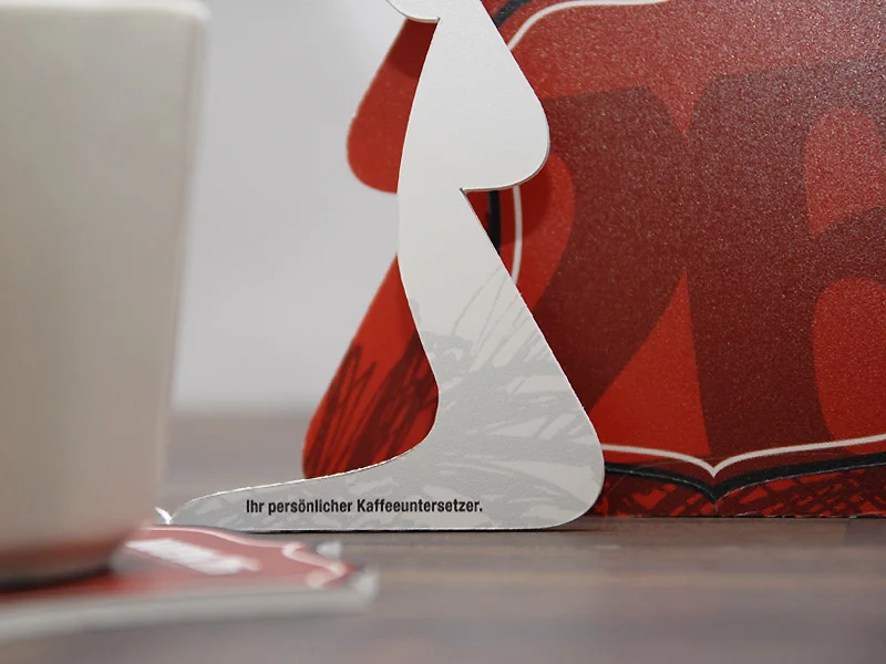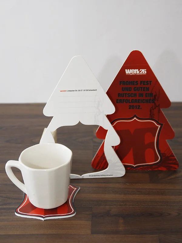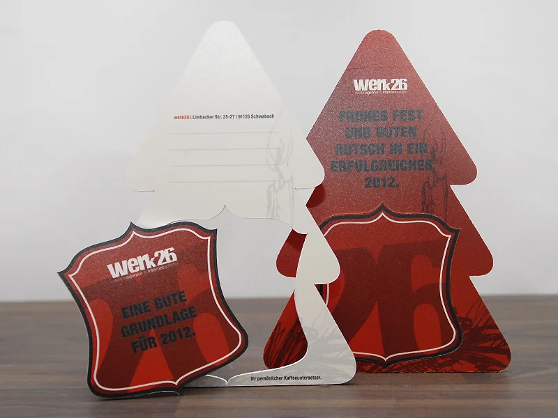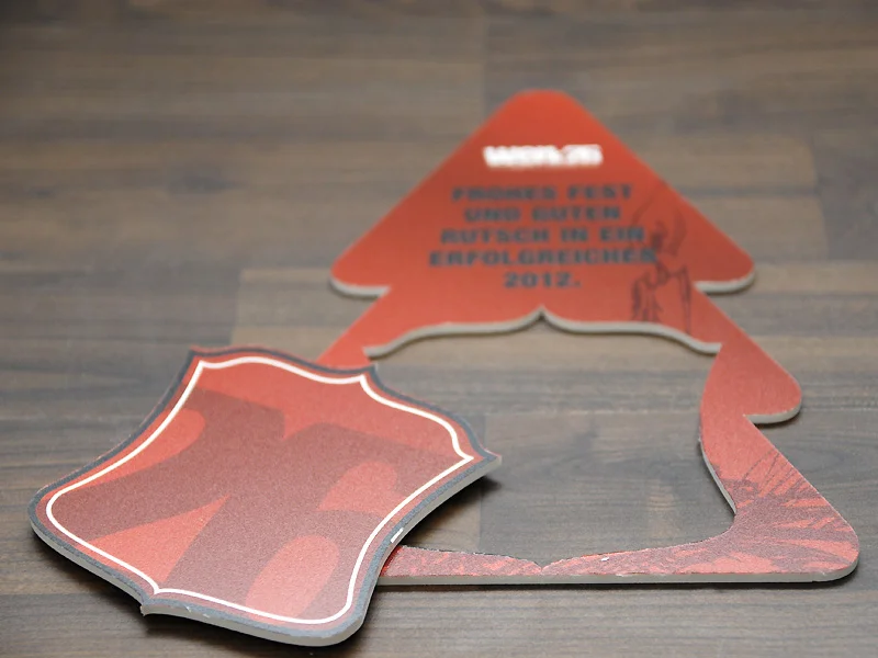 Die “Postkarte” in Christbaumform ist aus einer bedruckten Hartschaumplatte gefräst. Wenn Weihnachten vorbei ist, kann die Karte als Getränkeuntersetzer weiterverwendet werden: Der Untersetzer ist ausgefräst und mit Fixpunkten versehen. Einfach herausdrücken und schon ist die gute Grundlage für Kaffeetasse/Bierflache/Proseccoglas und das Jahr 2012 geschaffen.