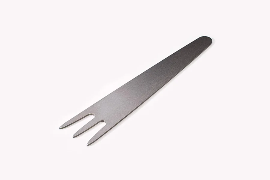 Schlichte Eleganz vereint sich mit krosser Delikatesse. Die Pommes-Frites-Gabel besteht aus federhartem Edelstahl in einer Stärke von 0,8 mm. Dieser spezielle Edelstahl zeichnet sich durch eine hohe Verschleißfestigkeit aus. Durch spezielle Zieh- und Patentierverfahren ist der Stahl im höchsten Maße schwingungsfest und verfügt über eine hohe Streckgrenze. Er wird durch einen Laser geschnitten und veredelt: Eine Beizung beseitigt eventuell verbliebene Grate, anschließend wird der Stahl gebürstet und erhält so einen gleichmäßigen Strich. Dieser ‚letzte Schliff’ verleiht der Gabel die edle Anmutung.