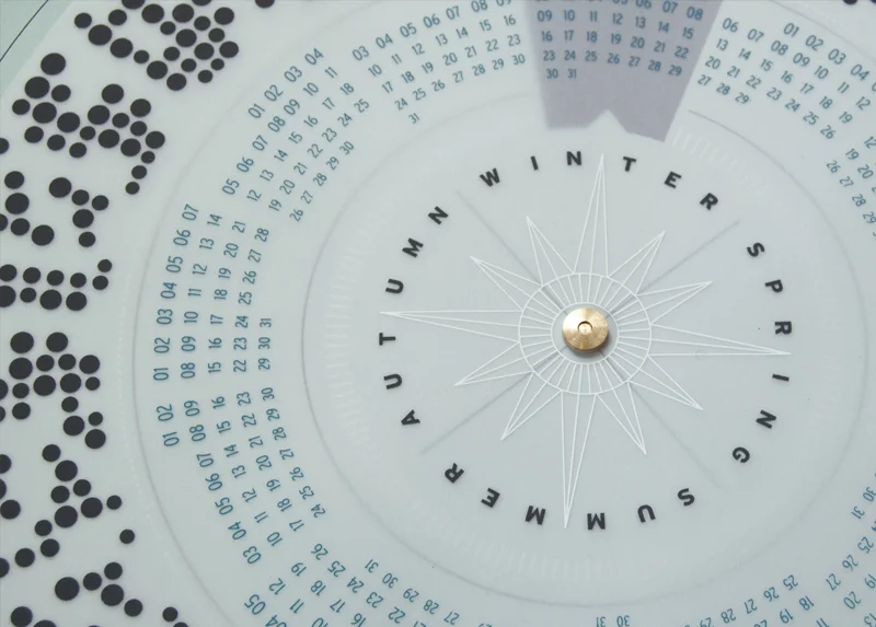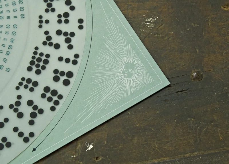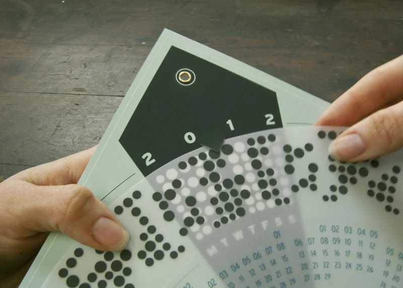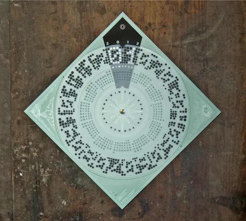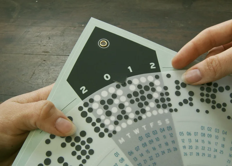 Der Kalender für 2012 funktioniert durch Drehen der Transparentpapierscheibe. Der Zahlencode zeigt den Monat an, dh er ergibt zwölf mal im Jahr Sinn, dann stimmen auch die Ziffern im Kalendarium und man kann den Wochentag ablesen.