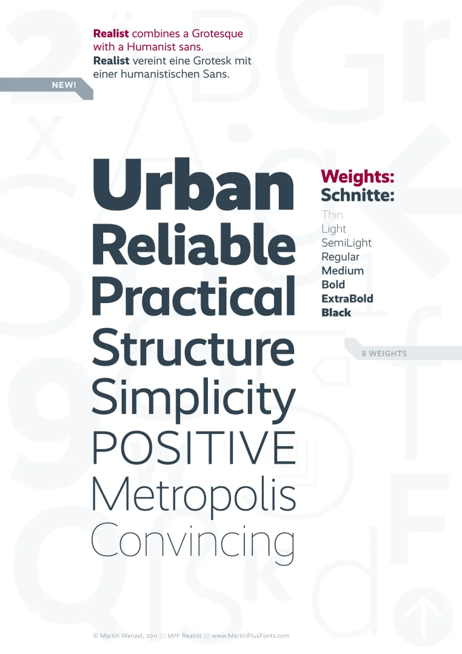 Die Verfügbarkeit einer Vielzahl von Gewichten kann dem Anwender die Arbeit um einiges erleichtern, weil es mehr Flexibilität erlaubt. Aus diesem Grund gibt es die Realist in acht Strichstärken: Thin, Light, SemiLight, Regular, Medium, Bold, ExtraBold und Black
