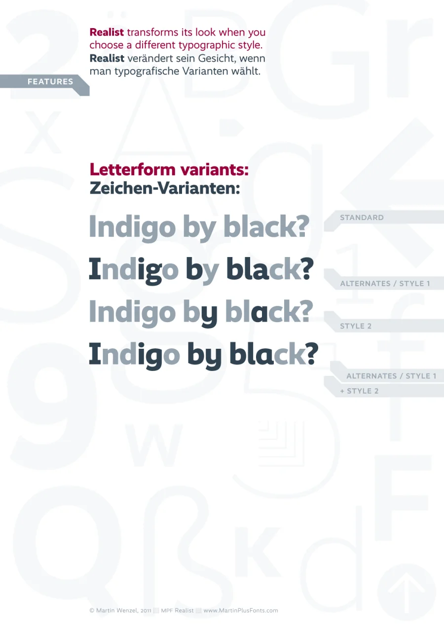 Mit der Realist versuche ich beide Traditionen einander näher zu bringen, in dem ich Charaktere beider Genres in einer Type vereine. Mit Hilfe von OpenType-Stilen kann der Designer diverse Buchstaben und Satzzeichen ganz einfach austauschen und so dem Schriftbild eine andere Anmutung verleihen – mal die Entschlossenheit und Symmetrie einer Grotesk, mal das Runde und Sympathische einer Sans.