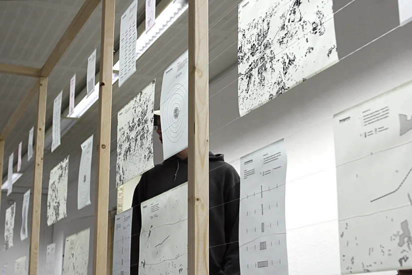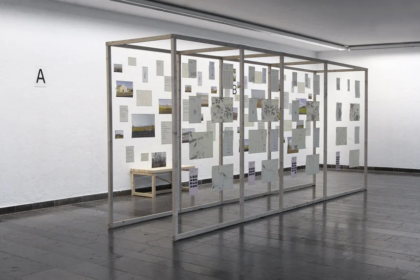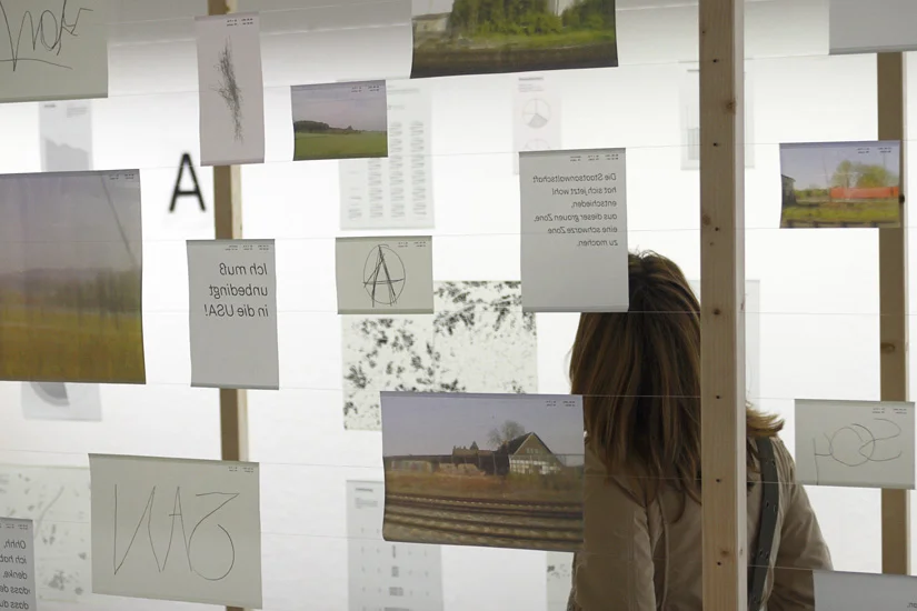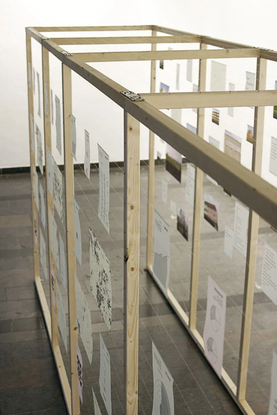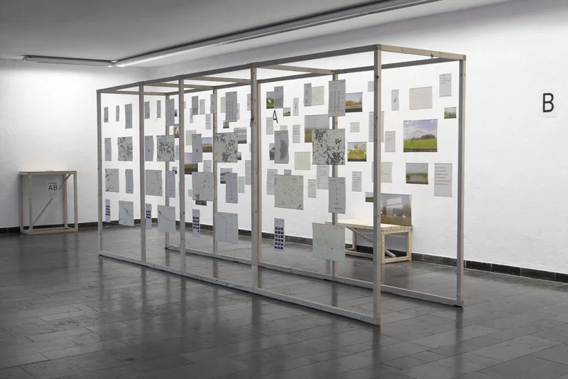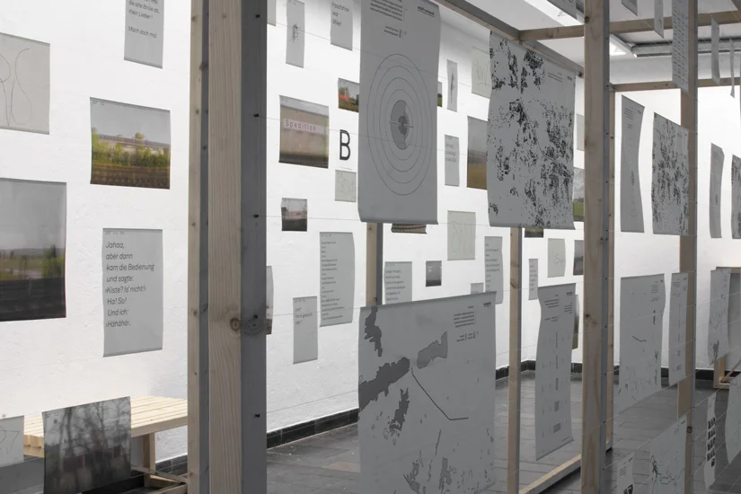 Meine Diplomarbeit AB befasst sich mit dem täglichen Pendeln zwischen Bielefeld und Porta Westfalica. Ich sammelte subjektive und objektive Daten während der Fahrt und stellte diese in einer begehbaren Installation, visuell gegenüber. Einerseits erfasste ich objektive Daten wie z. B. die Lärmbelastung an der Strecke, die Höhenunterschiede der verschiedenen Orte, die Einwohnerzahl im Vergleich zur Flächengröße der Orte oder die Bewaldung an der Strecke. Andererseits subjektive Daten, wie Handyfotos, Tonaufnahmen von Gesprächen der Mitreisenden oder abgepauste Fensterkratzer.