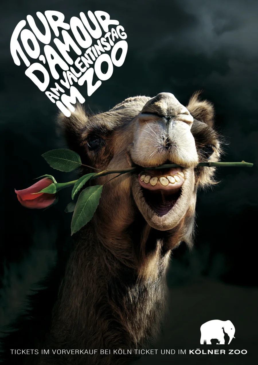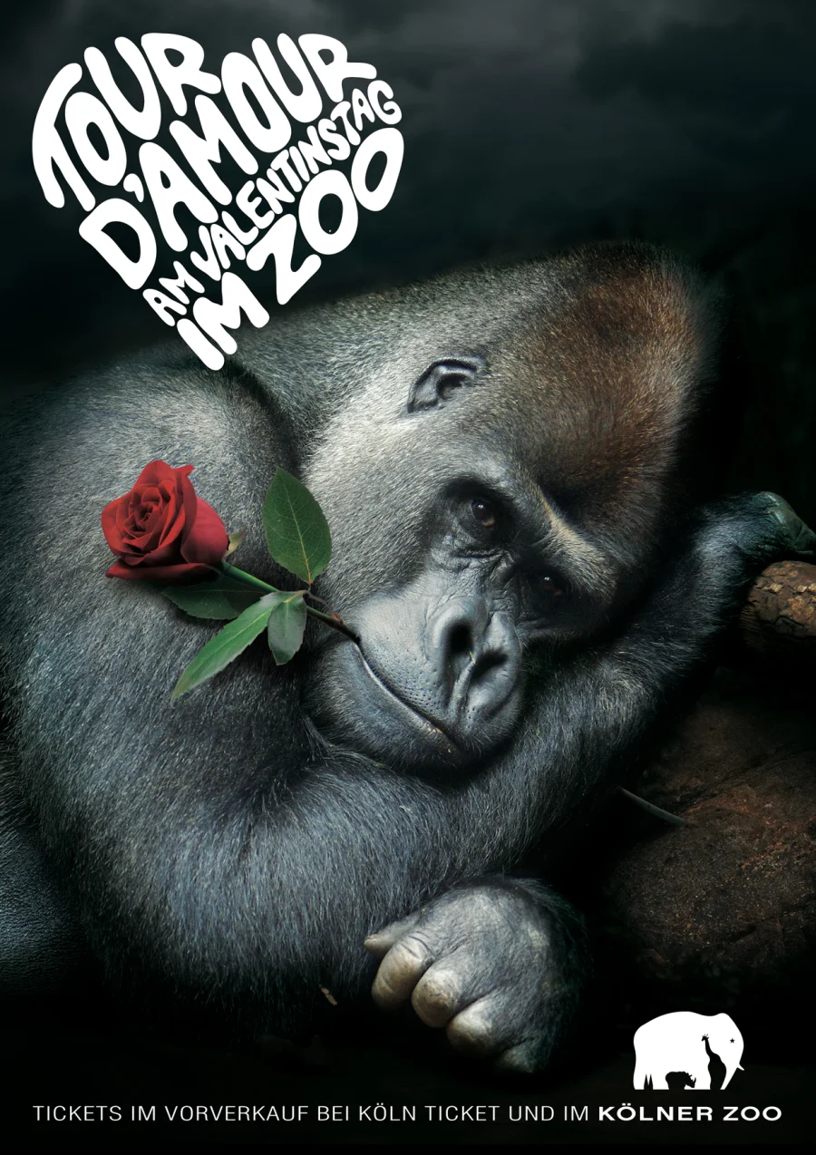 Der Kölner Zoo zeigt für seine inzwischen zum 4. Mal stattfindende Veranstaltung “Tour D’Amour” am Valentinstag „Rosenkavaliere“ in romantischer Abendstimmung. Doch statt heißblütiger Südländer haben hier Zootiere wie Gorilla, Kamel und Eule eine Rose im Mund.