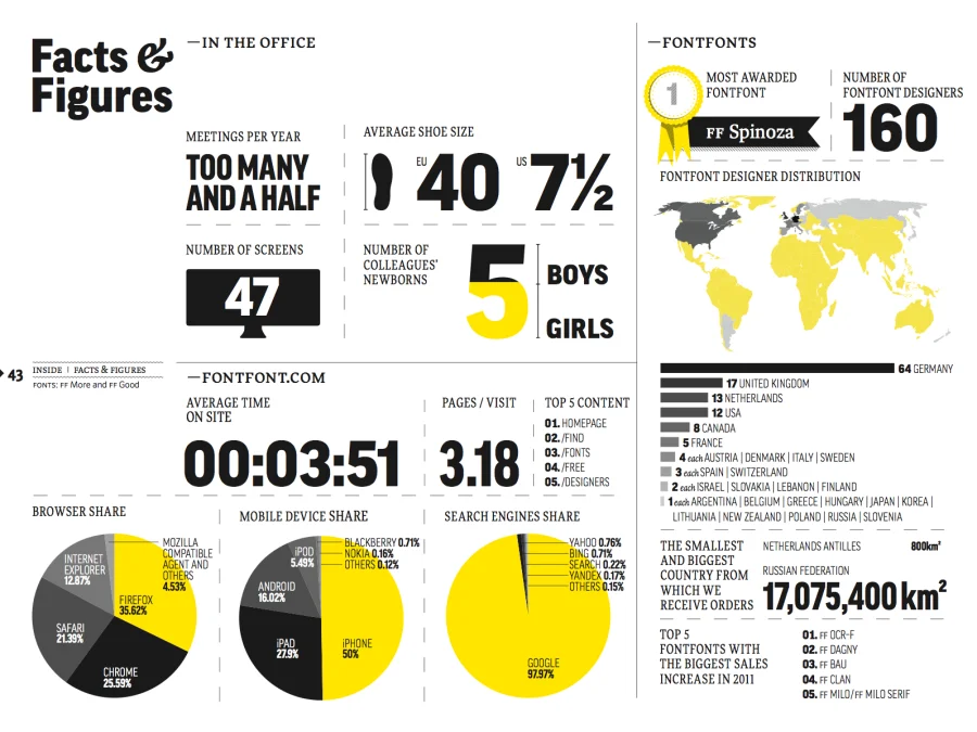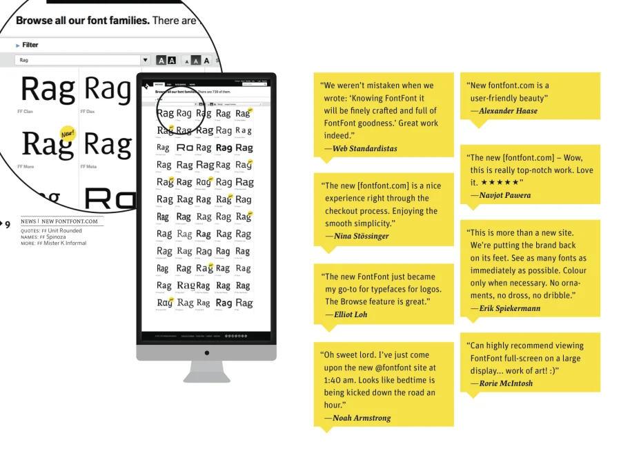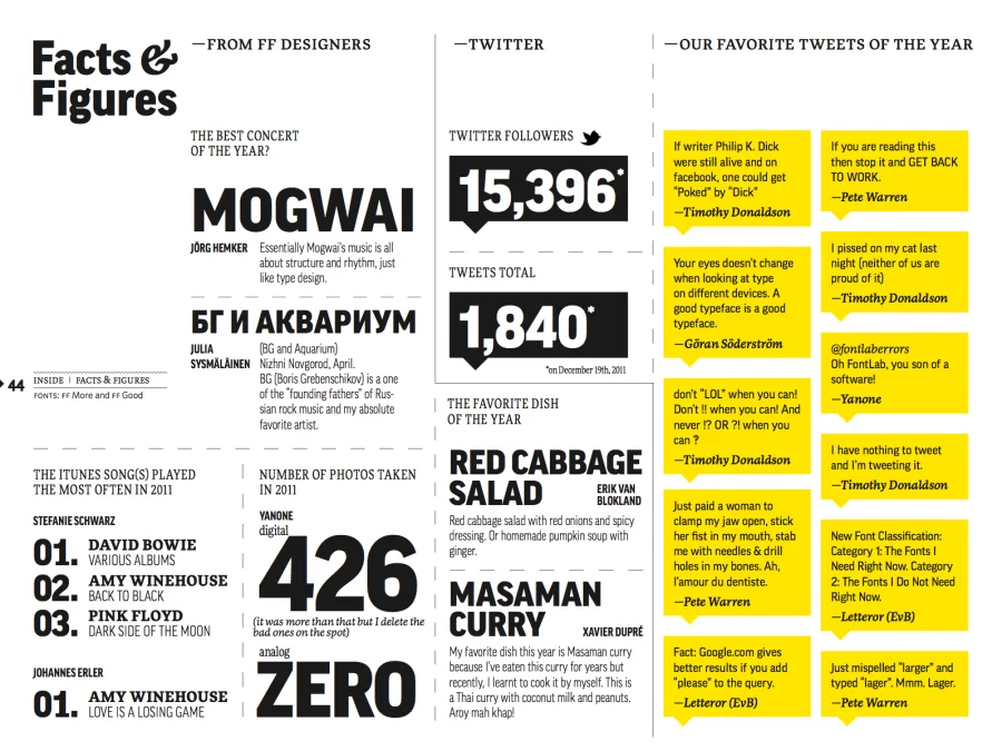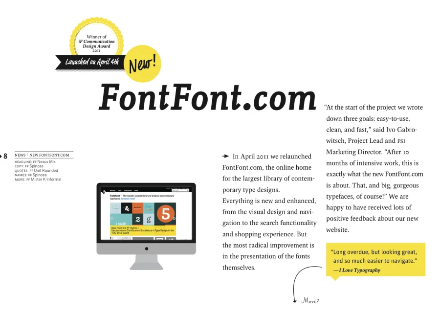 Erstmals in seiner 22-jährigen Geschichte legt das Schriftenhaus FontFont einen Jahresbericht vor. Mit gutem Grund: Noch nie gab es innerhalb von 12 Monaten so viele Entwicklungen und Neuerscheinungen wie 2011 – angefangen mit der Aufnahme von vier FontFonts in die ständige Ausstellung des New Yorker MoMA bis hin zur Veröffentlichung der Mobile FontFonts für tragbare elektronische Geräte.