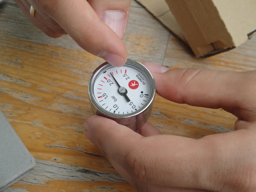Für die unterschiedlichen Anwendungen gibt es unterschiedlich feine Varianten. Für den Manometer z.B. ist das Logo nur einige Millimeter groß und diese werden im Siebdruck bedruckt. Das war ein Kampf, bis der Kaffee-Duft wieder zu sehen war und man beim Zulieferer verstand, dass meine Beschriftungsdatei die Akkurat enthält und deshalb keine Helvetica-Ziffern verwendet werden sollen.