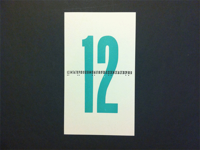 Zwanzigzwölf ist ein untypischer Kalender. Die Hauptidee bei dem Projekt war es, einen Kalender ohne einen einzigen Buchstaben zu konzipieren. Die schmalen Ziffern im leuchtenden Türkis stehen für den jeweiligen Monat. Um die gesamte minimalistische Anmutung des Kalenders nicht zu zerstören, sind die Samstage und Sonntage nur durch kleine runde Stanzungen markiert.