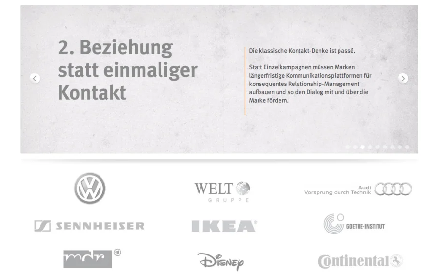 Hierzu wurde vor allem an der Art und Weise der Präsentation und Nutzerführung optimiert. Aus einer vormaligen Flash-Website mit Kreis-Menü und viel Weißraum bietet die neue Website nun viele Slider. Diese schaffen auf eine angenehme und nicht zu direkte Weise gleich drei Dinge auf einmal:
