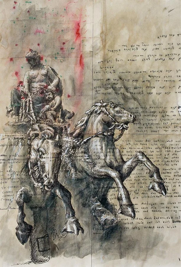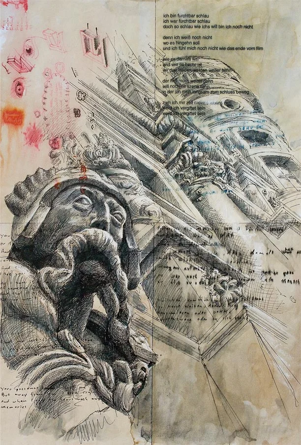 Die Zeichnungen werden auf zusammengesetzten Skizzenblättern angefertigt. Es werden keine hochwertigen Materialien verwendet, nur Stifte, Kinderwasserfarbe oder Kreide. Als würde das Motiv keinen Aufschub dulden. Als müsse es sofort auf Papier gebracht werden. Mit dem, was da ist. Da sonst seine Seele verschwinden würde. Wie die Kritzeleien in einem Tagebuch. Von vornherein dazu verurteilt, keine makellose Schönheit zu werden. Darin eben besteht die Faszination dieser Bilder.