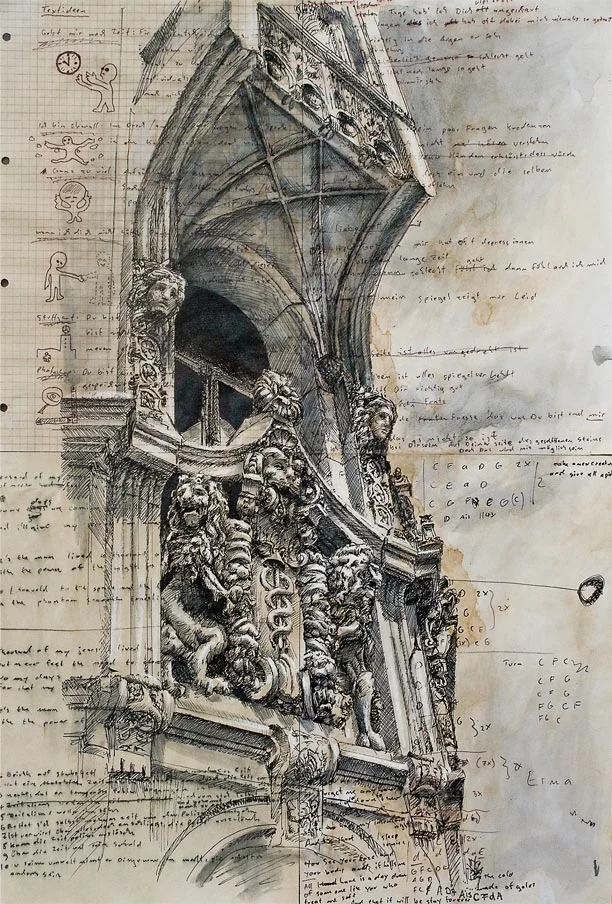 Alle Motive sind auf jeweils 4 zusammengesetzten Blättern angefertigt, die bereits durch Kritzeleien und Skizzen eigene Inhalte mitbringen. Dadurch bekommen die Motive eine weitere inhaltliche Ebene, die im wahrsten Sinne des Wortes darunter liegt. Die Inhalte der Skizzen haben keinen offenliegenden Bezug zum eigentlichen Thema. Es sind persönliche Aufzeichnungen des Illustrators, wodurch seine Individualität betont wird.