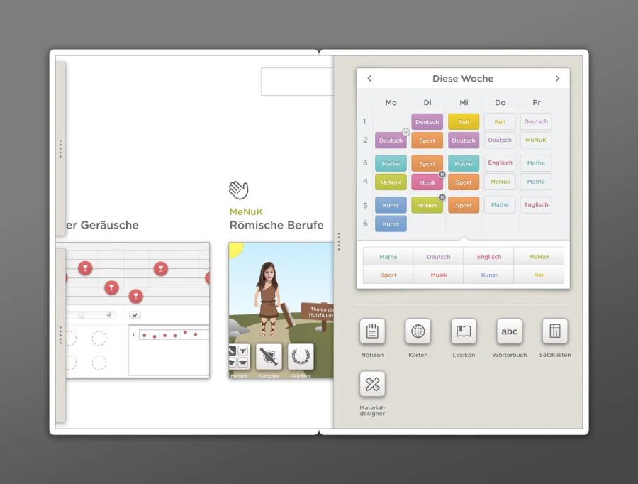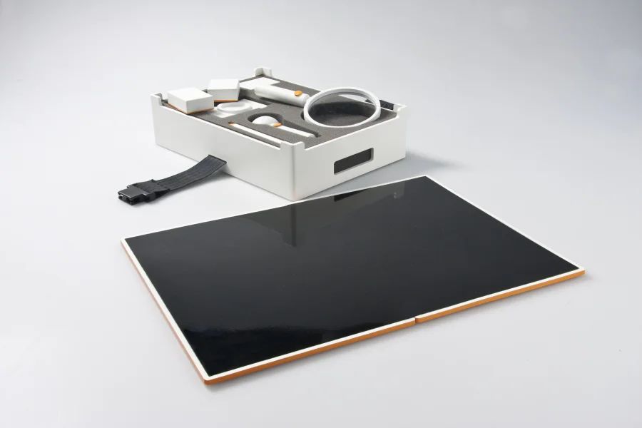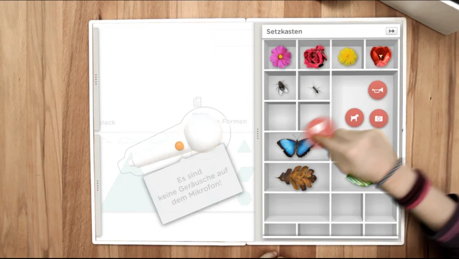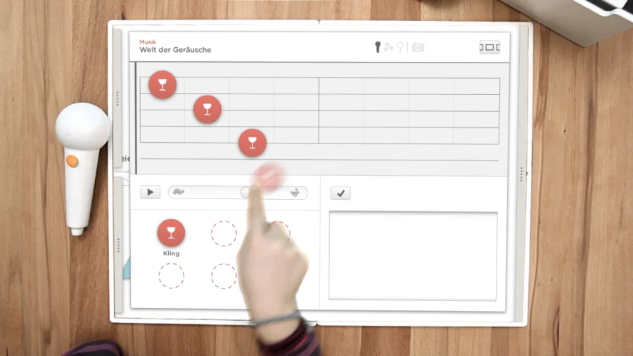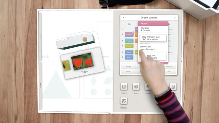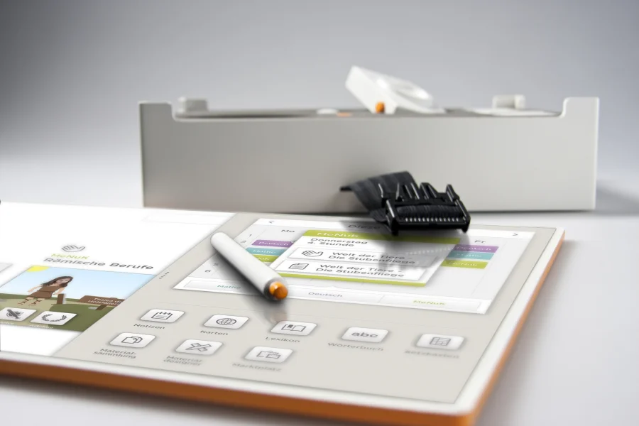 Das Set besteht aus einer Basis in Form eines faltbaren Doppelscreen Tablets und fünf Werkzeugen um der Eindimensionalität von Touchoberflächen entgegenzuwirken. Mit den Werkzeugen ist es möglich, Aufgaben anschaulich und spannend auf dem Tablet zu bearbeiten.