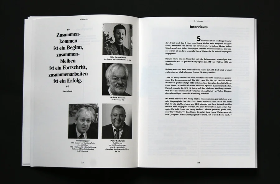 Als Journalist, Fotograf, Werber, Berater, Manager, sowie Leiter einer Agentur hat Harry Walter Positionen eingenommen, die ihn viel umgetrieben haben in seinem Leben, die im viele Türen geöffnet und viele Menschen vorgestellt haben. Aber vor allem gilt er als Vater des modernen Wahlkampfs in Deutschland.