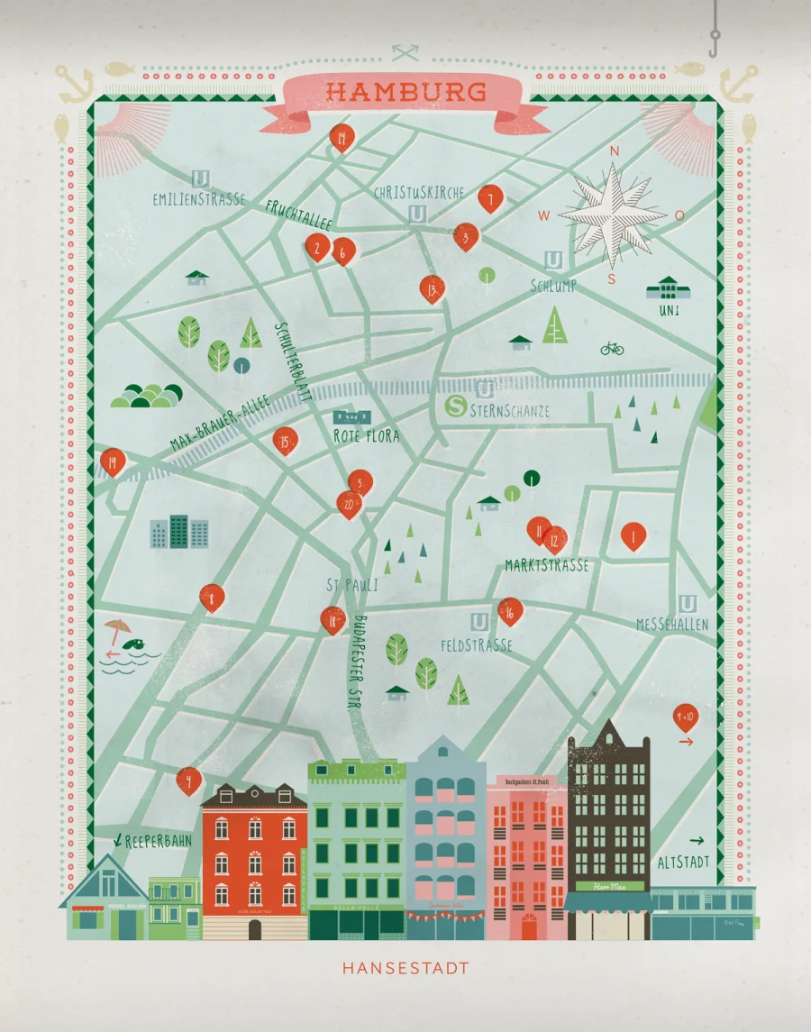 Für das CUT Magazine habe ich den Hamburg Stadtplan illustriert. Ein Glück, dass es Google Streetview gibt, so konnte ich mich ganz bequem vom Berliner Schreibtisch nach Hamburg zu den Tipps beamen und jedes Haus originalgetreu abbilden.