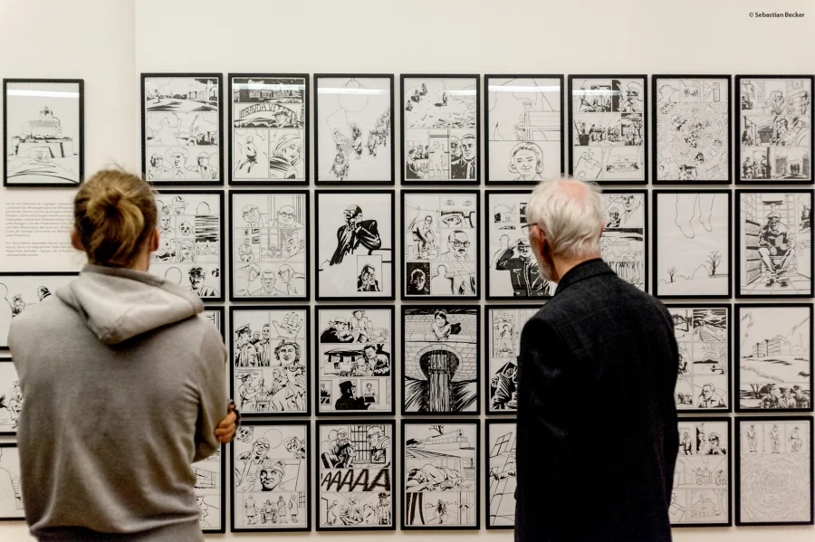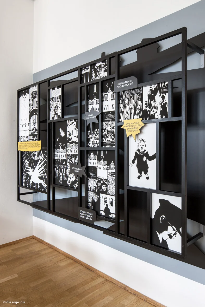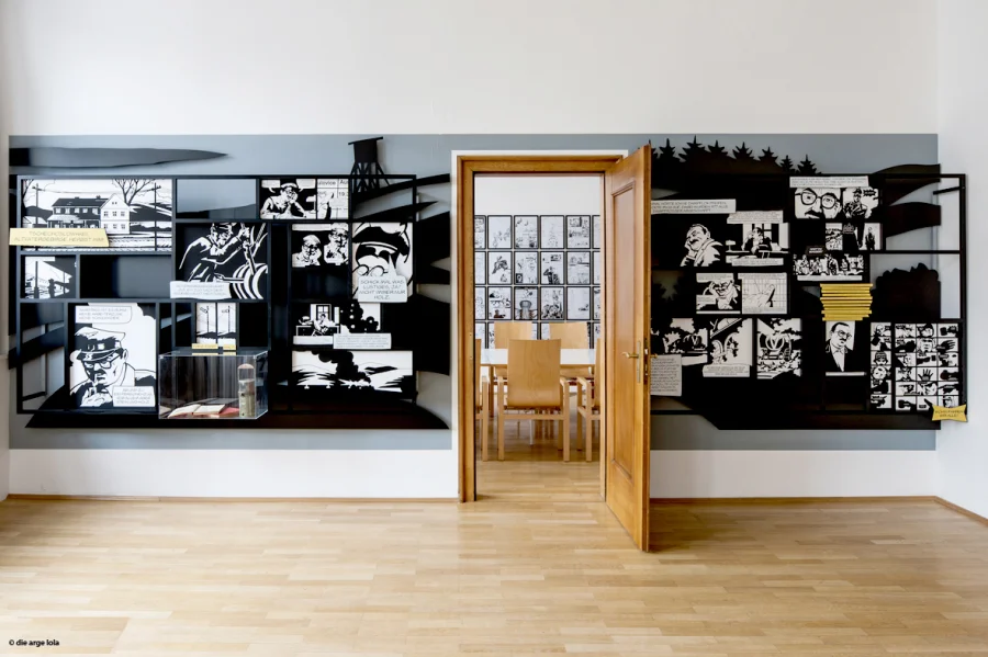 Zentraler Bestandteil der Ausstellung sind Lasercuts, die die holzschnittartige Optik des Comics aufnehmen und ein Rahmensystem, in dem die Bilder gehängt sind und Ausstellungsobjekte integiert sind. Dieses funktioniert wie eine stark vergrösserte, dreidimensionale Comicseite.