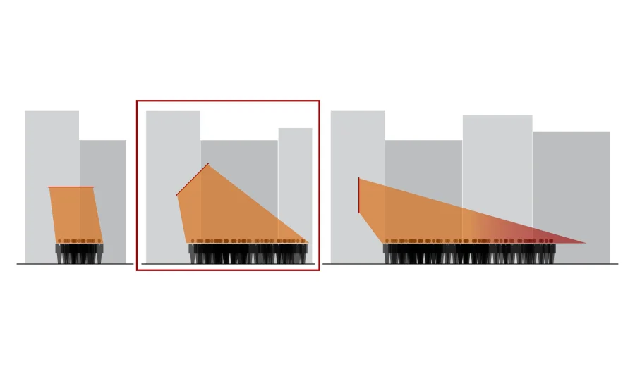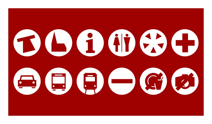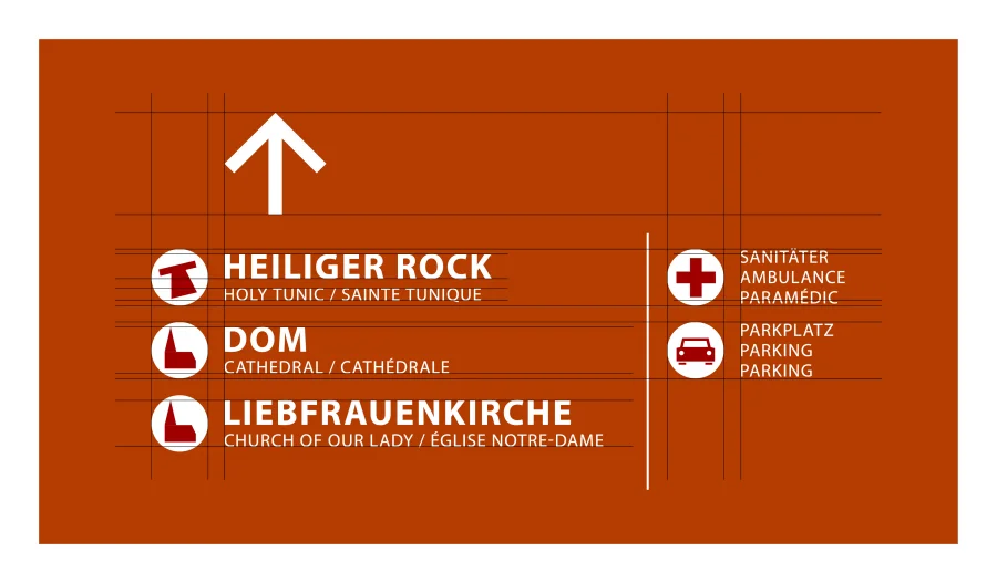 Da die Banner oberhalb der Kopfhöhe von Passanten und Pilgern angebracht werden, haben sie eine einzigartige Präsenz im Stadtbild. Zudem laufen sie nicht Gefahr, in der bestehenden Straßenbeschilderung unterzugehen. Ergänzend wurde ein passendes Piktogrammsystem entwickelt. Die Hinweise sollen trilingual und in einer klaren Typographie aufgebaut sein.