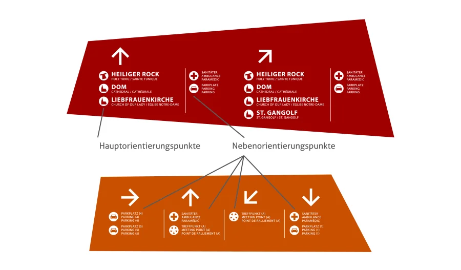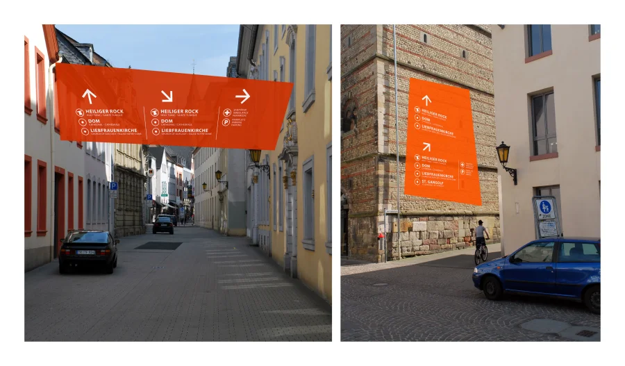Darauf basierend ist ein modulares Orientierungssystem konzipiert worden, das auf sehr großen, farbigen Bannern angebracht wird. Diese haben ein unregelmäßige Trapezform, die das tragende Element für die Zusammengehörigkeit des Orientierungssystems ist. Diese Form leitet sich aus gedachten Einzelteilen des Heiligen Rocks ab.