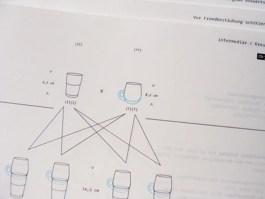 Die Kreuzungen habe ich anhand von Infografiken dargestellt, die in ihrer Darstellung an die bekannten Vererbungstafeln aus der Biologie erinnern. Von den Ergebnissen habe ich Glasobjekte von einer Glasbläserin herstellen lassen.