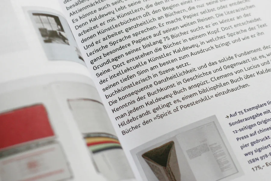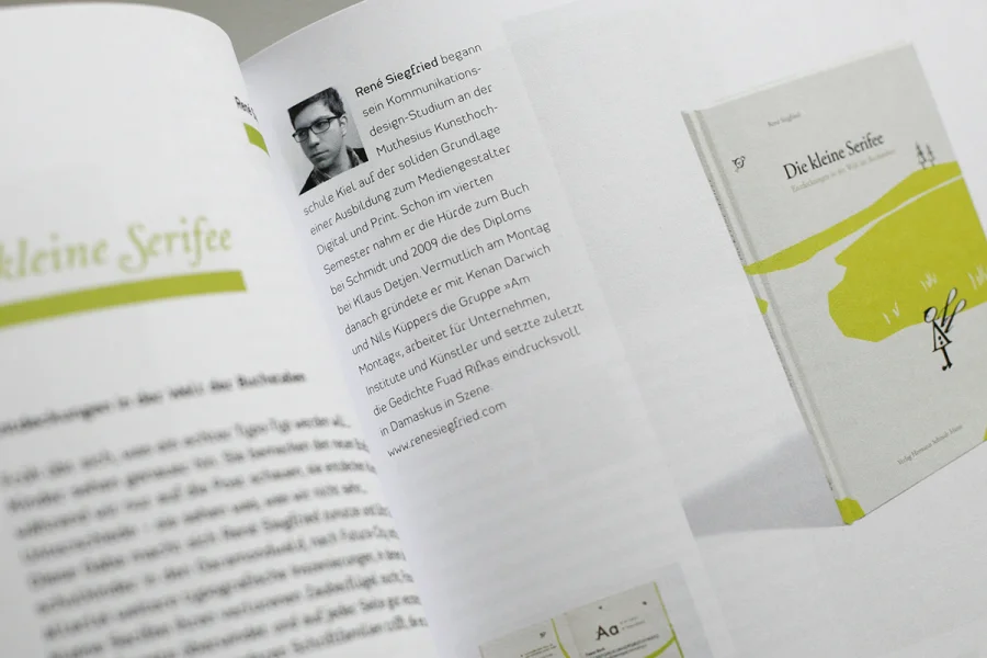 Die ungewöhnliche Schriftmischung von Heimat Sans für den Fliesstext und Adobe Caslon für Überschriften spielt an auf die unterschiedlichen Generationen von Autoren, die vom Verlag vertreten werden.