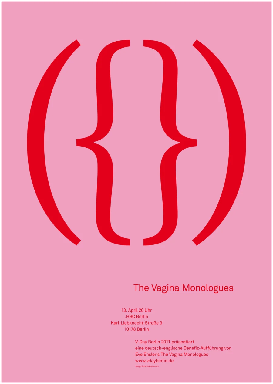 Plakat für die Deutsch-Englische Theateraufführung der berühmten »Vagina Monologue« der New Yorker Theater Aktivistin Eve Ensler, das auf rund 200 Interviews mit Frauen beruht. Das Theaterstück wendet sich gegen Gewalt gegen Frauen und Mädchen.