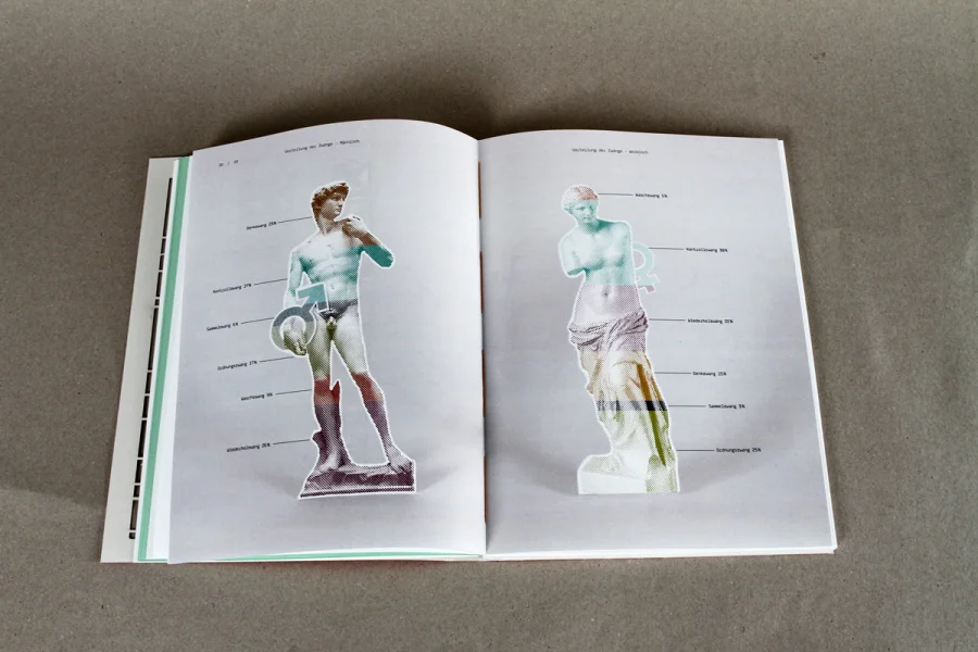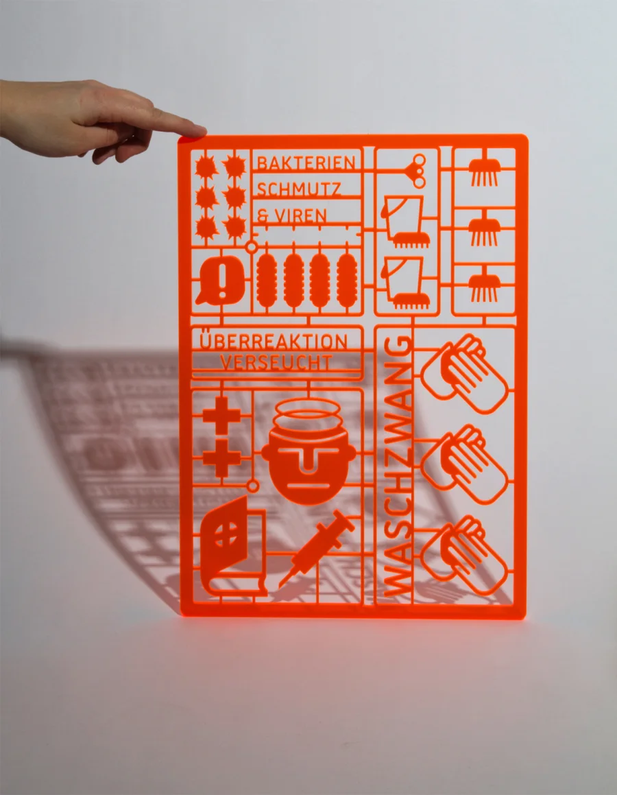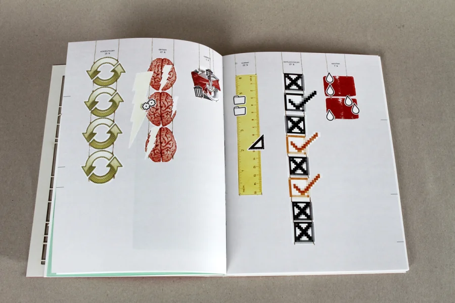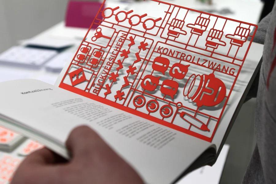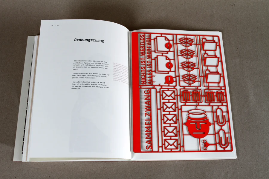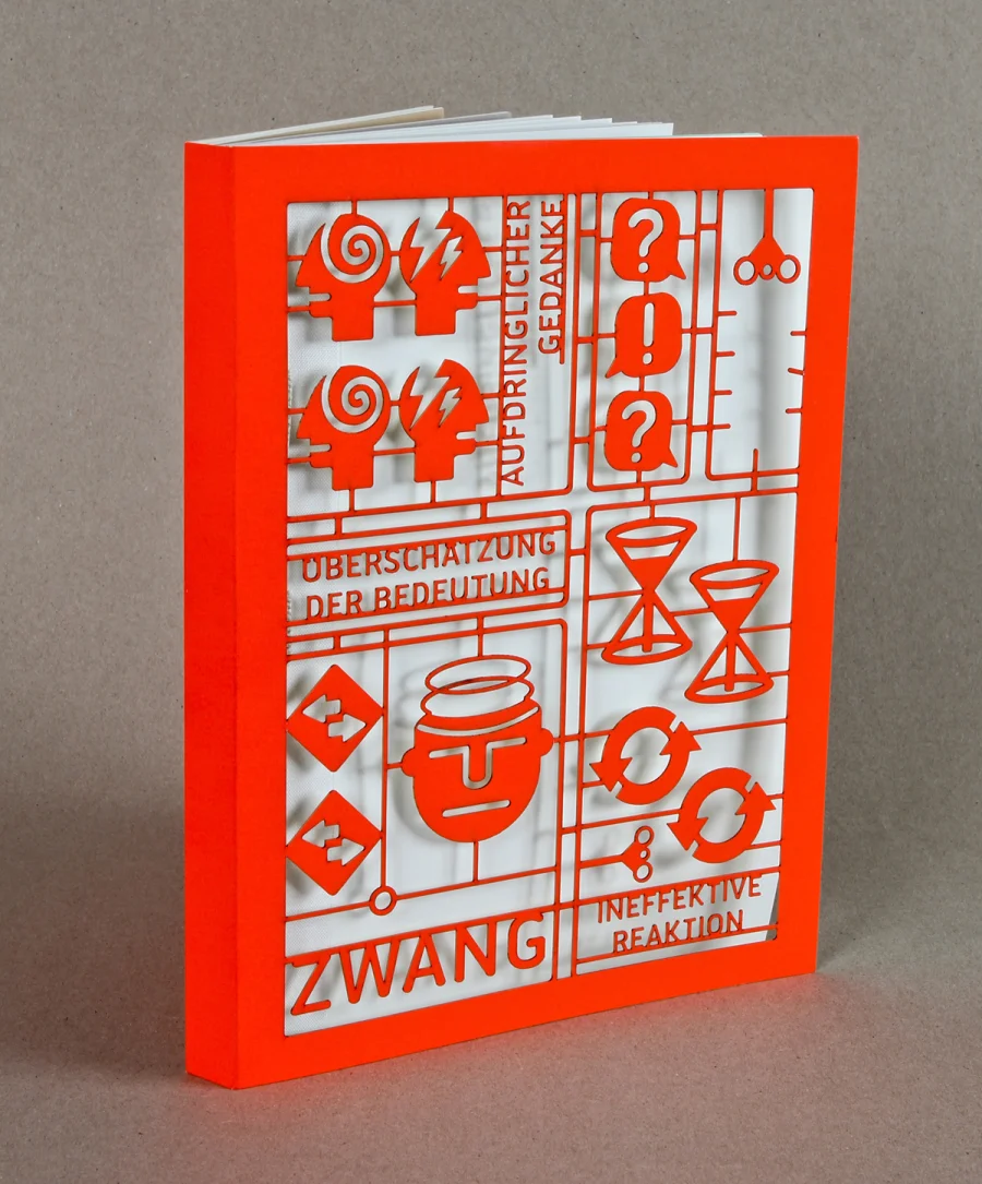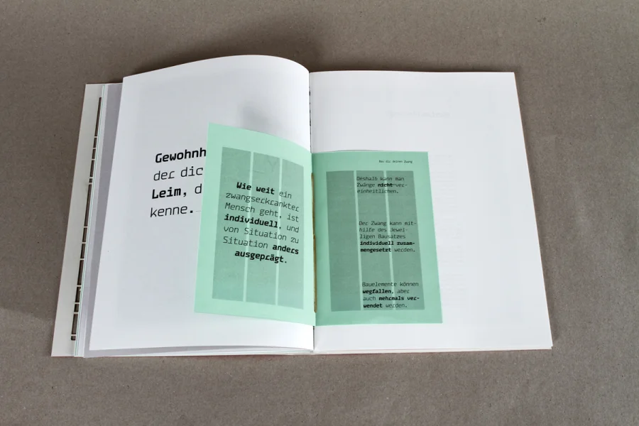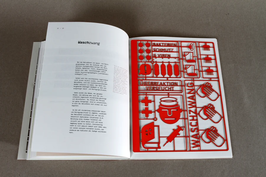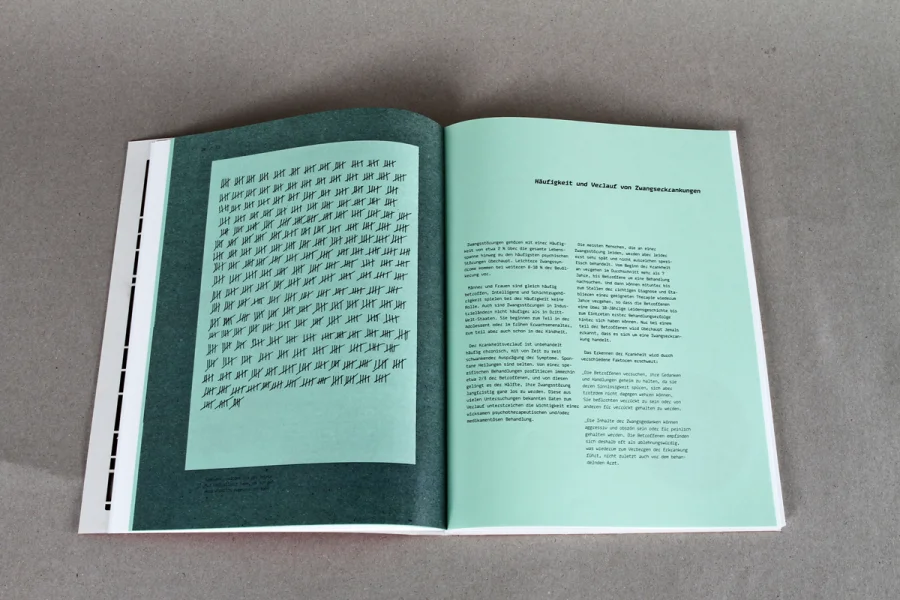 Das Buch über Zwänge macht den komplexen Sachverhalt der Zwangsstörung mithilfe von Illustration und Informationsdesign sichtbar. Die drei Kapitel umfassen die theoretische Auseinandersetzung mit der Krankheit, eine statistische Auswertung von Zwänge im Alltag und DIY-Bausätzen um den eigenen Zwang zusammenzusetzen bzw. den Kreislauf der verschiedenen Zwänge zu verstehen.