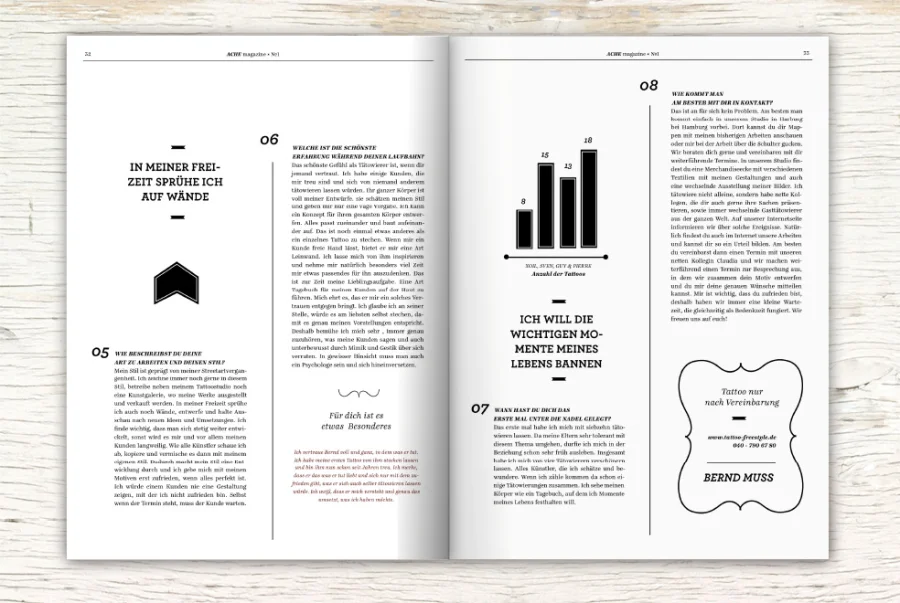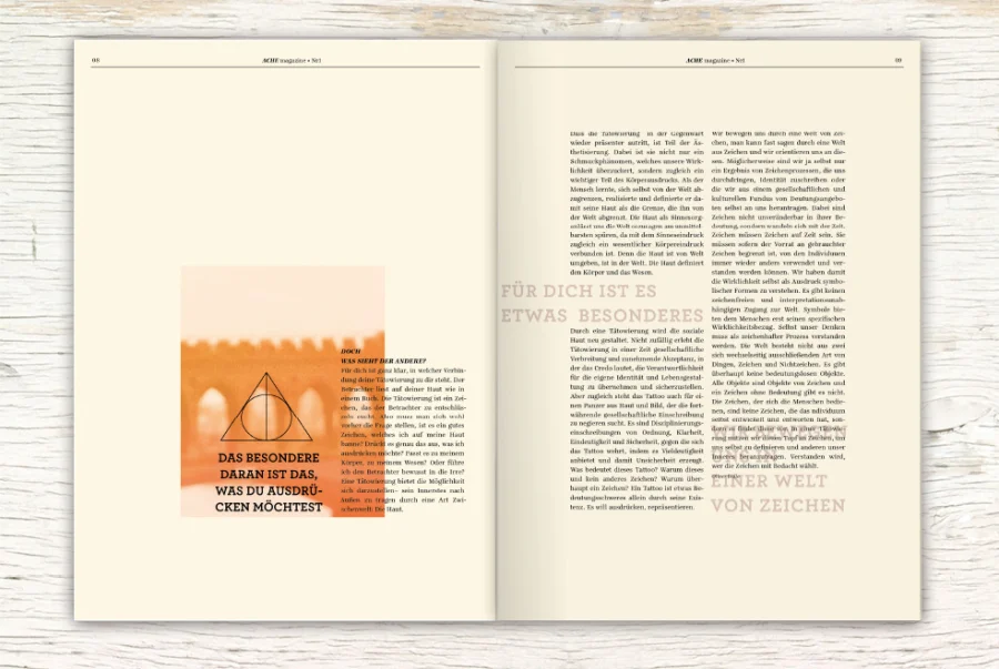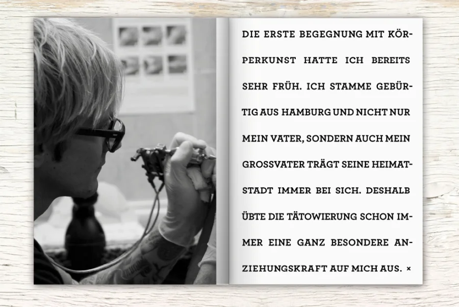 Ungelöst ist für viele immer noch die Frage, warum sich der Einzelne tätowieren lässt. Wahrscheinlich sind die Gründe so vielfältig wie die Persönlichkeiten, die sich zu einem solchen Schritt entscheiden. In dieser Arbeit äußern sich einige junge Leute zu ihren persönlichen Konzepten und dazu, wie sie das Thema Tattoo und Körperschmuck für sich auslegen. Ist es besser sich lange mit einem Motiv auseinander zu setzen, bevor man es auf die Haut bannt? Müssen alle Tätowierungen verbunden sein? Fragen wie diese werden hier beantwortet und führen Neuinteressierte in die Konzeptwelt ein.