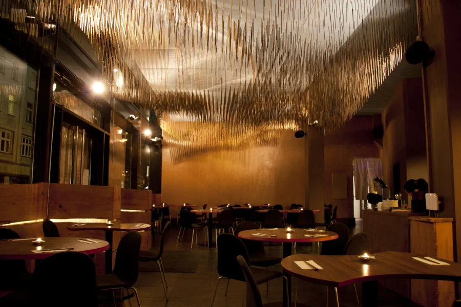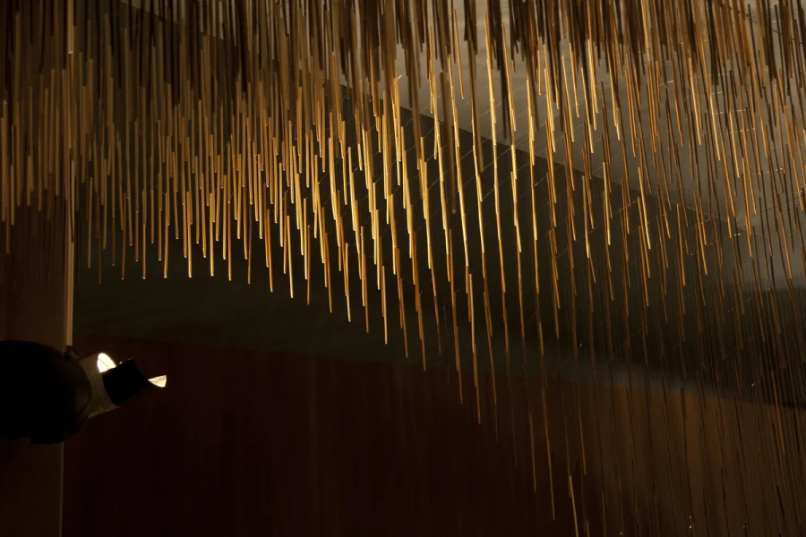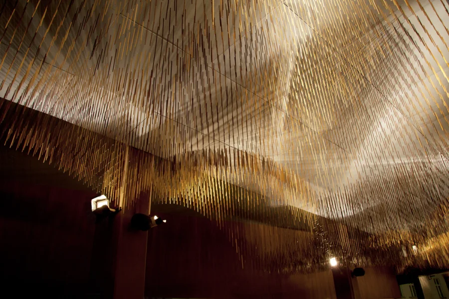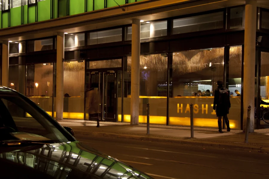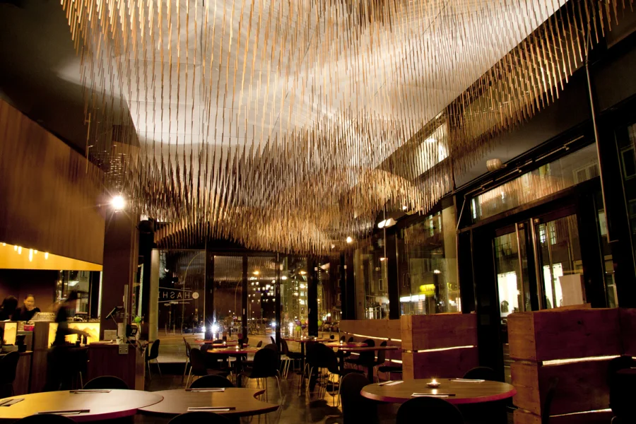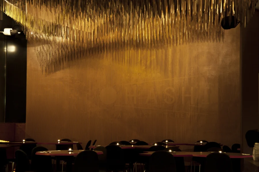 Innenraumgestaltung für ein Japanisches Izakaya Restaurant im Berliner Zentrum. Hauptmerkmal ist die Hashi Mori Deckeninstallation, in der traditionelle Materialien und Handarbeit mit computergestützter Modellierung und Programmierung verschmelzen. Zusammengesetzt aus 13.454 handgebohrt-, gebeizt- und geschnürten Bambusstäbchen, 57.400 Knoten und über 20 Km Nylonfaden, benötigte die Ausführung 14 Mitarbeiter und über 3 Wochen Handarbeit.