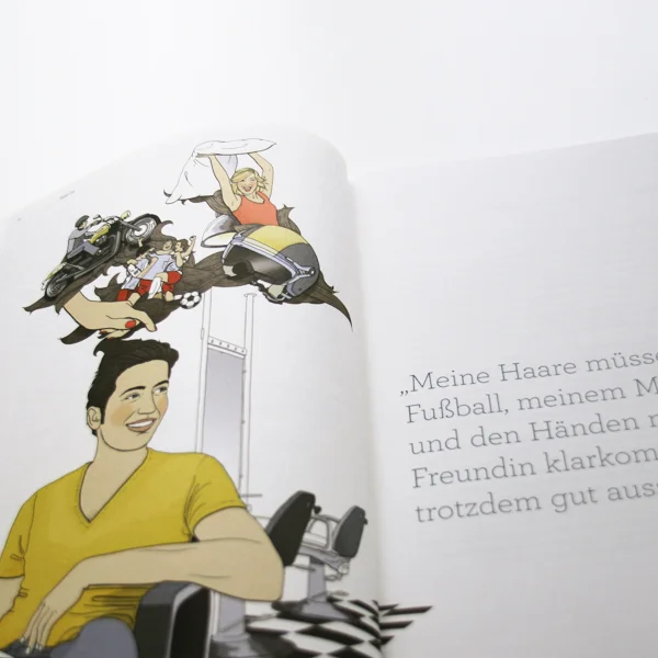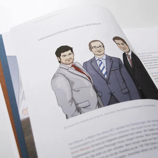 Was denken Kunden eines Friseursalons eigentlich über ihre Haare? Für den Geschäftsbericht 2011 haben wir uns von Kunden der verschiedenen Essanelle-Salonkonzepte erzählen lassen, was ihnen beim Thema Haare, beim Gang zum Friseur so durch den Kopf geht und welche Assoziationen bei Ihnen entstehen. Ein paar ausgewählte Gedanken ließen wir dann von Anne Lück illustrieren – und den Vorstand gleich mit.