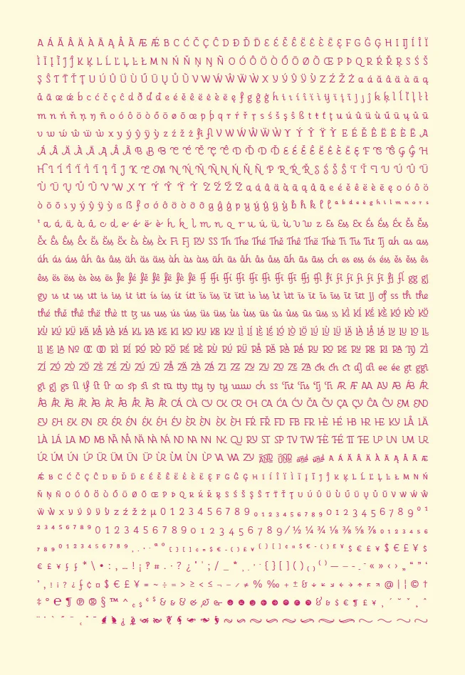 Canary is a hybrid of left italic antiqua and brush painted script. It provides many automated and connectable letter substitutions that can slightly shift the font into the field of lettering rather than that of rigid and mundane typography. Canary is designed to be compatible with a wide range of illustrative design practice. However, it works really well in medium-length copy settings as well.