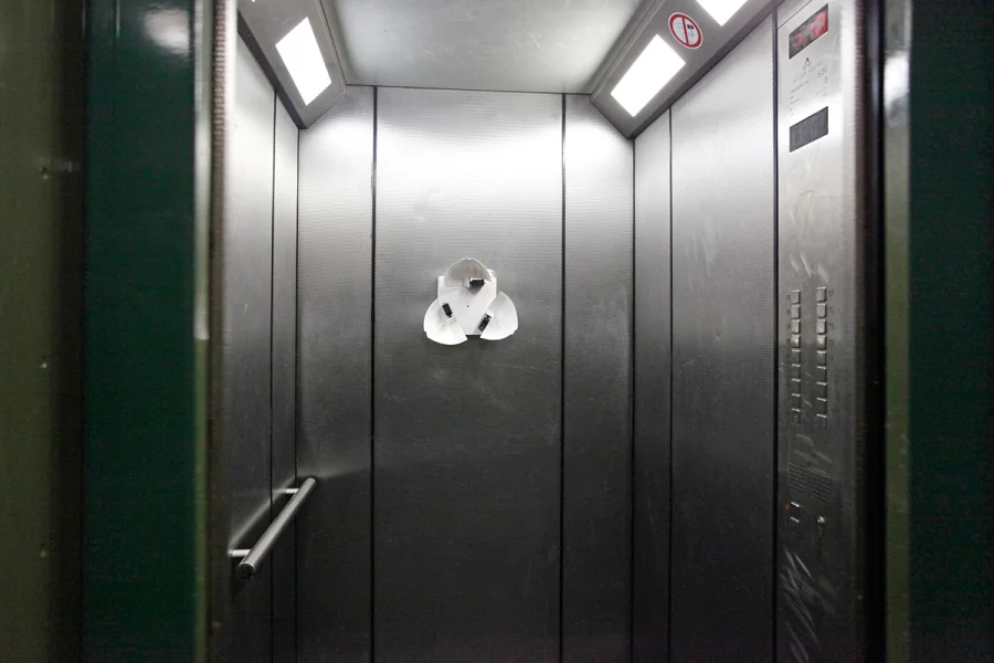 Der Weg in die Wohnung führt in einem Hochhaus unweigerlich über den Fahrstuhl. Wie wir in den Interviews erfahren haben, ist das einer der wenigen Begegnungspunkte im Haus. Jeder von uns kennt die eigenartige Situation, die entstehen kann, wenn man mit anderen Leuten im Fahrstuhl ist: Das Verhalten reicht von betretenem Schweigen, über das Herumspielen mit dem Mobiltelefon bis zum angestrengten aneinander Vorbeistarren. Wir haben uns gefragt, was passiert, wenn wir etwas an diesen Ort bringen, was dort nicht hingehört.
