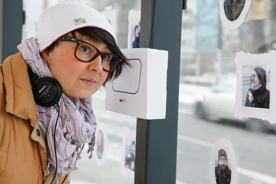Eine Box, die an ein Radio erinnert, hängt an der Haltestelle. Zwei junge Männer stehen davor und lauschen. Später ist es ein älterer Mann mit Pfeife und Hackenporsche. Eine junge Frau bleibt stehen und drückt den Knopf für die nächste Geschichte. Sie lässt ihre Straßenbahn fahren, hört weiter zu. »Wenn ick jetz wüsste, die wohnen da und da. Ick wüsste nich wie ick mich denn verhalte. ‚Tach, ick bin euer Vater. Hier bin ick.ʼ Na dit würd ick wahrscheinlich ooch nich machen. Die waren ja noch kleen. Det einzige wat se jesacht ham an der Tür: ‚Bleib hier!ʼ Also dit werdʼ ick meen Leben nich verjessen. Aber wie man eben war im Suff – wat jeht mir dit an.«