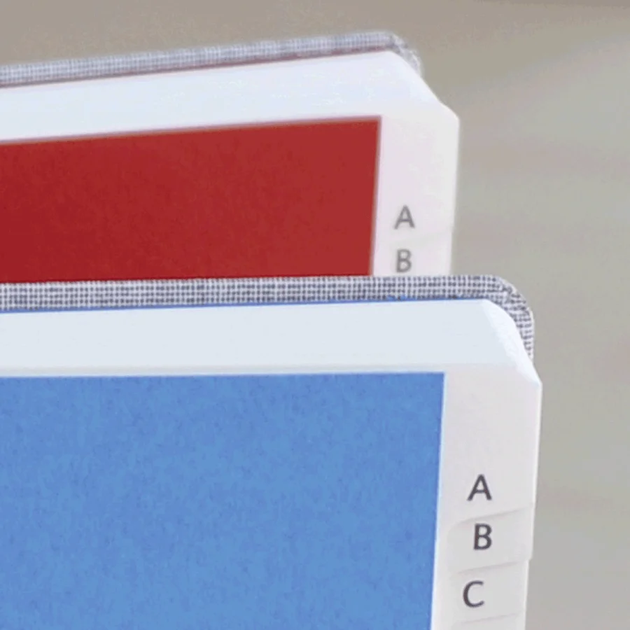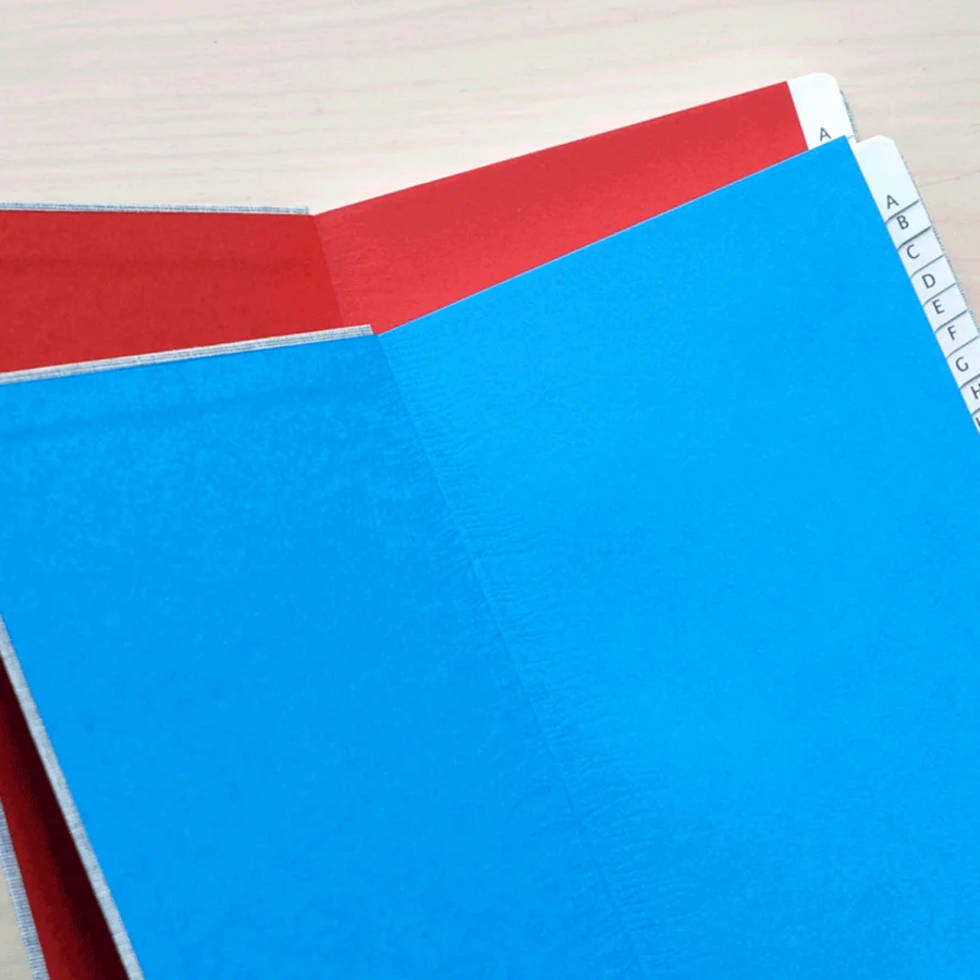 Als Extra und Kontrast ist das Vorsatz in kräftigen Farben gehalten: rot oder türkis.