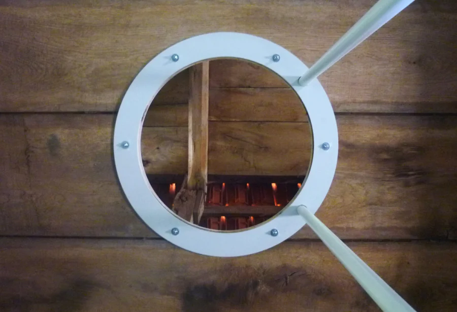 Der Ring leitet in einen zweiten Raum, in dem Leuchtbänder vor die Wände montiert sind. Eine Holztreppe führt in das erste Geschoss, eine Schiffsleiter ermöglicht dort einen Blick durch eine kreisrunde Öffnung in den Giebel. Steckt der Besucher seinen Kopf hindurch, ist eine Sound-Montage aus Geräuschen von Haus, Hof und Wald zu hören.