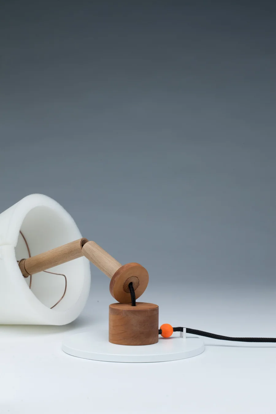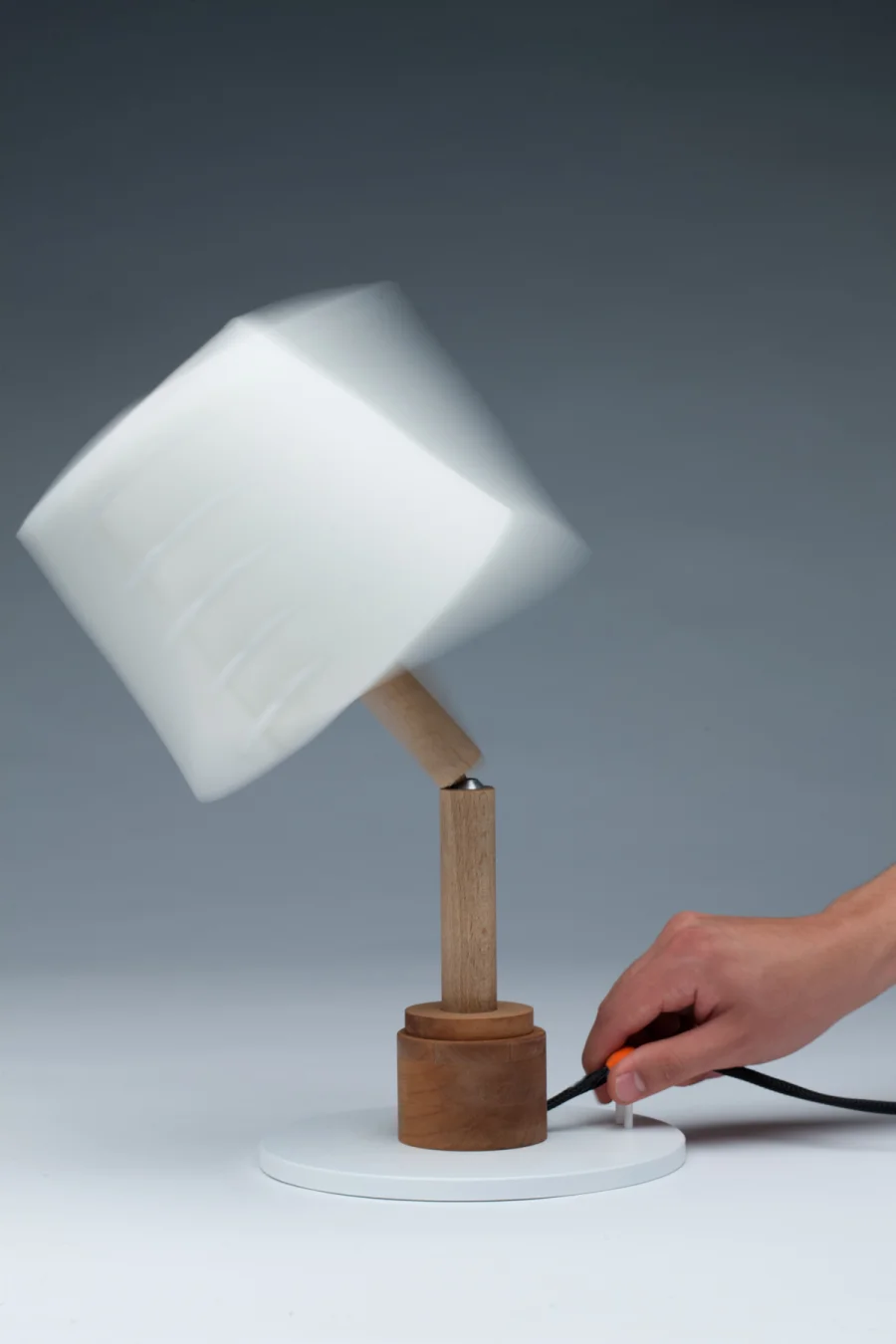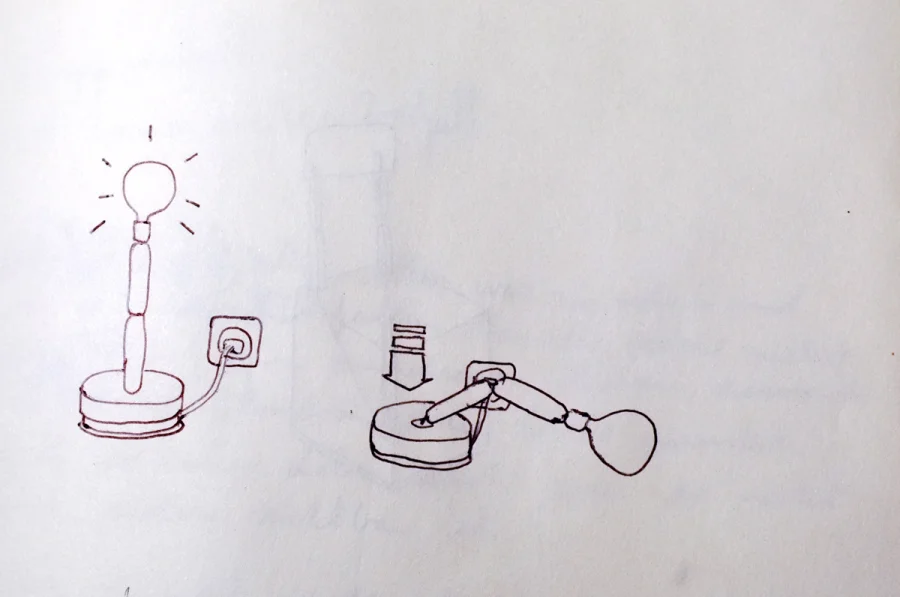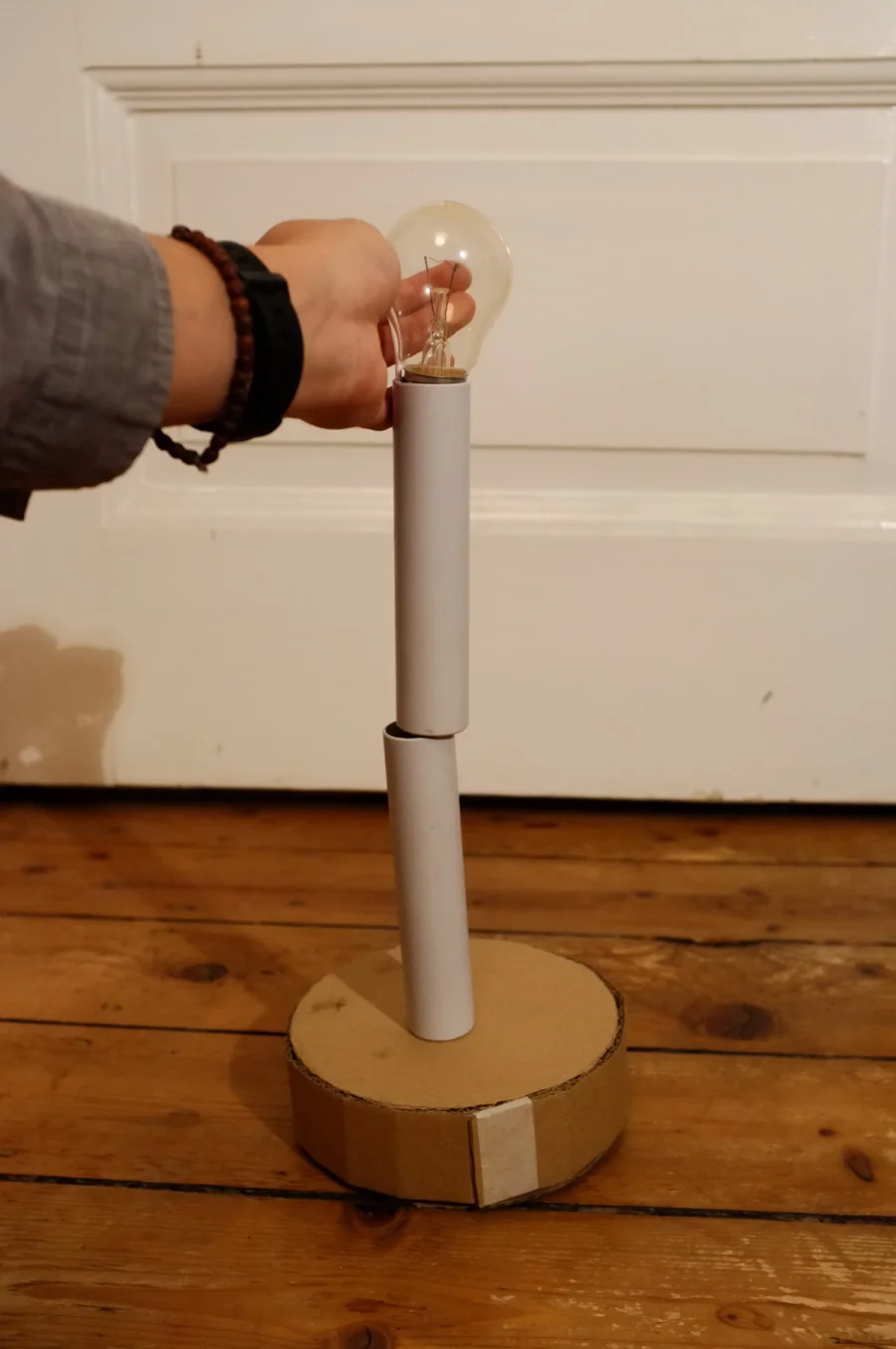 Als umsetzbares Produkt ist eine Tischlampe enstanden, die beim Ausschalten in sich zusammenfällt und beim Einschalten wieder aufsteht. Dafür habe ich mir den Mechanismus der Wackelfigur zu Nutze gemacht.