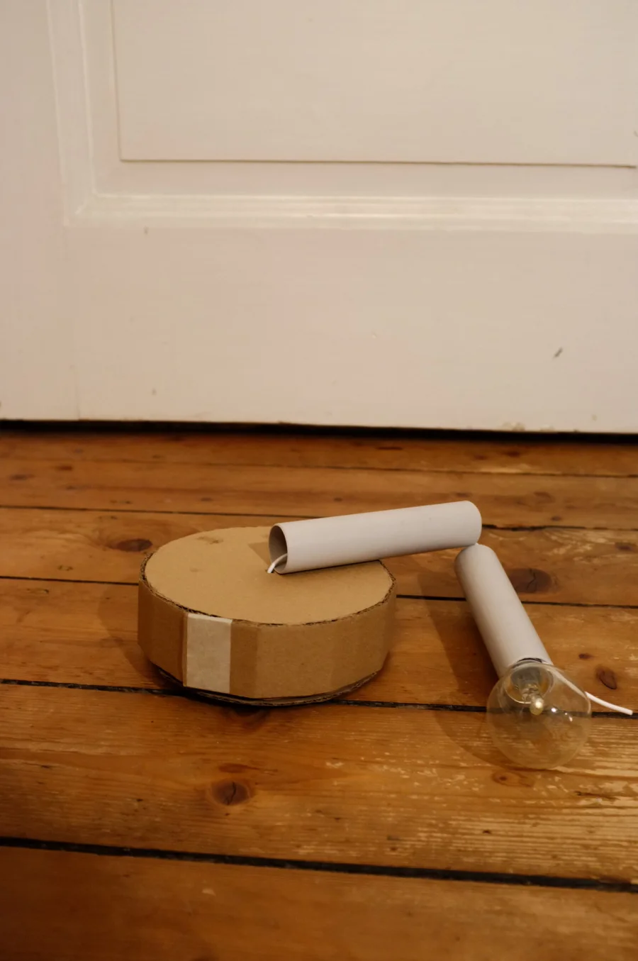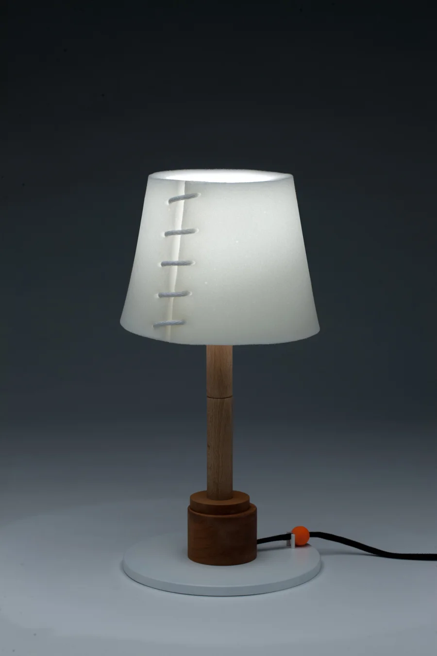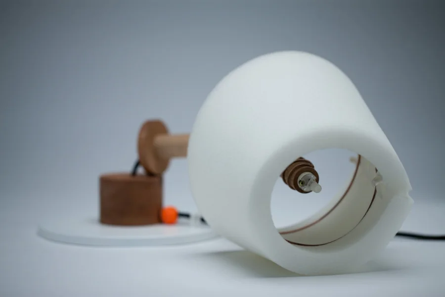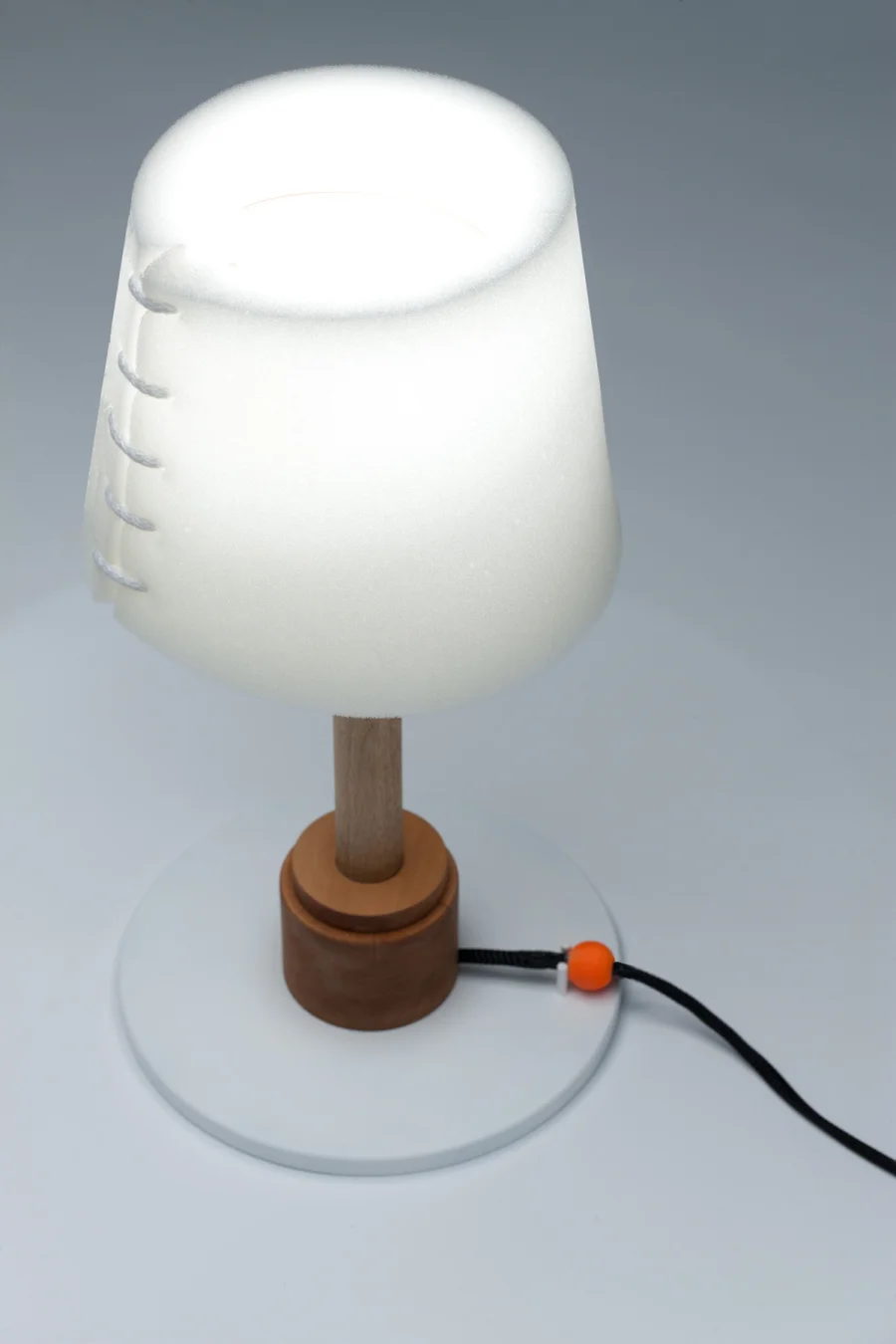 Als umsetzbares Produkt ist eine Tischlampe enstanden, die beim Ausschalten in sich zusammenfällt und beim Einschalten wieder aufsteht. Dafür habe ich mir den Mechanismus der Wackelfigur zu Nutze gemacht.